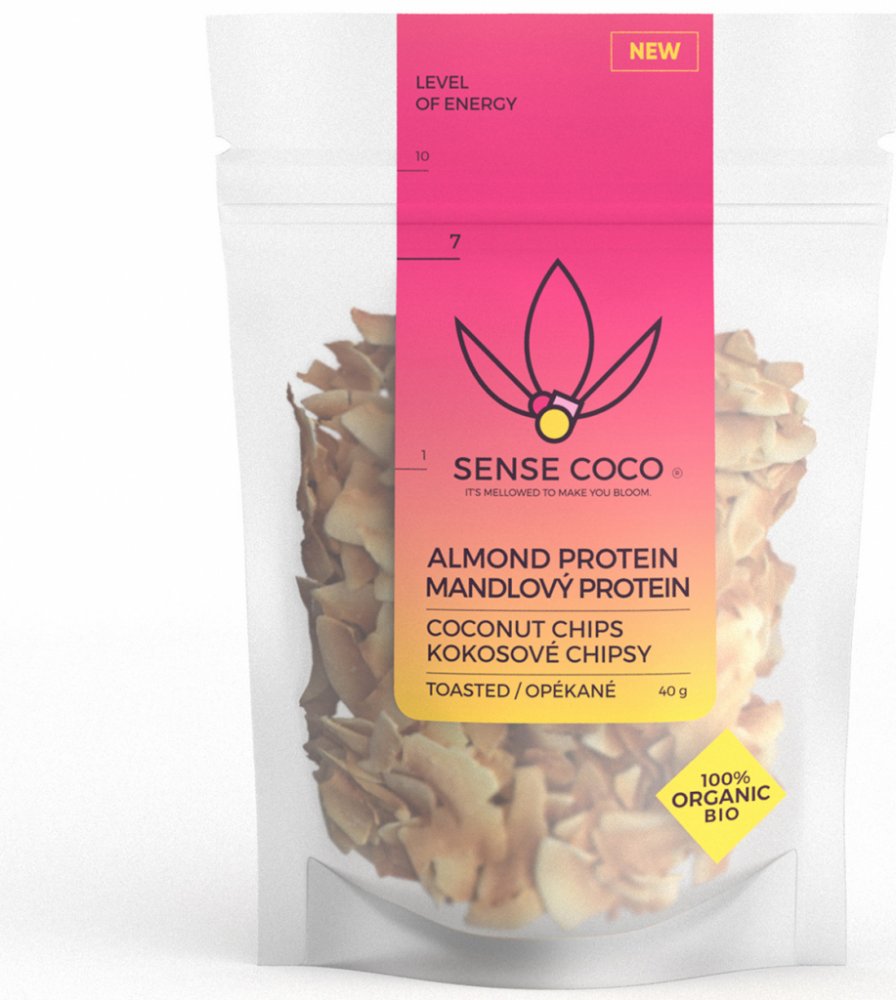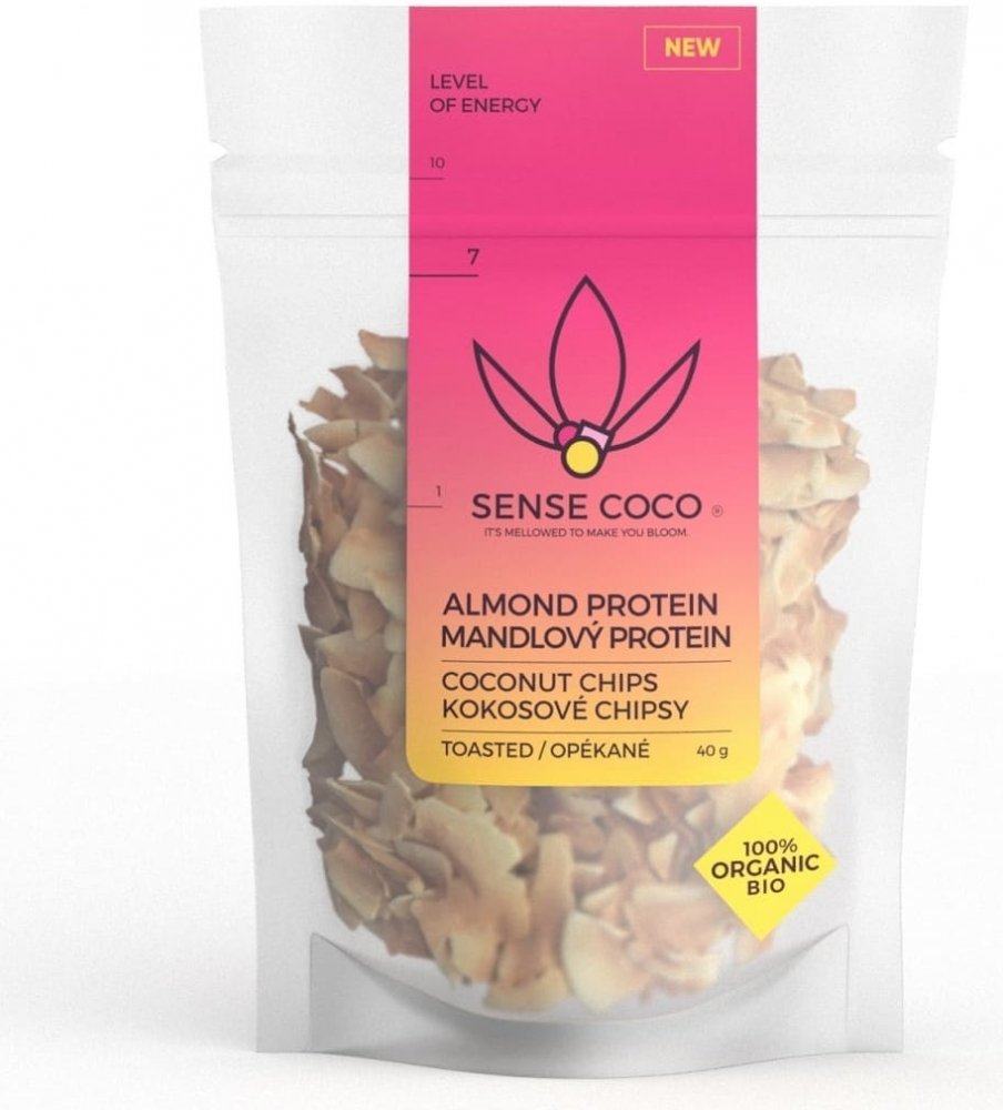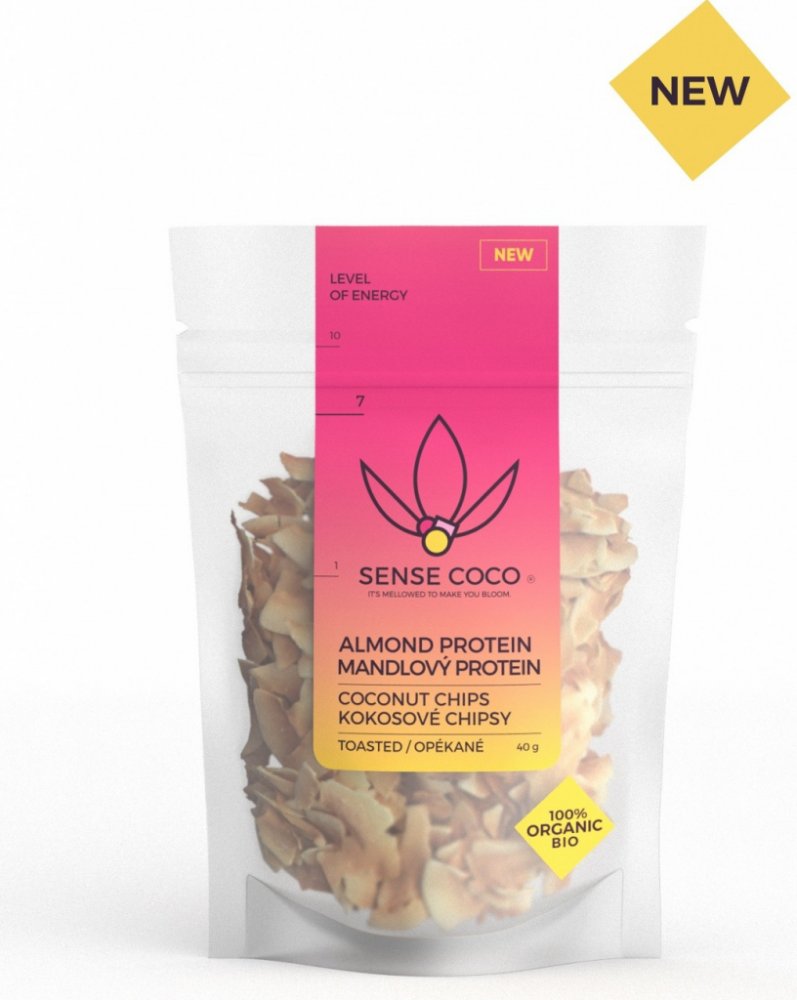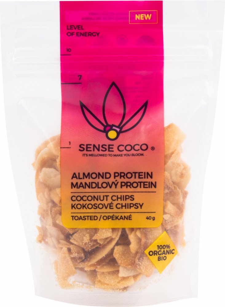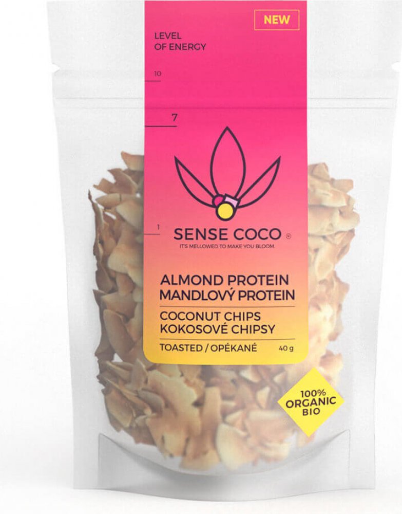 Bio kokosové chipsy Sense Coco ENERGY s mandlovým proteinem jsou díky své vysoké energetické hodnotě výborné jako svačina na dodání energie po sportovním výkonu nebo v průběhu náročného dne. Jejich základ tvoří opékané chipsy z kokosové dužiny, jemně dosolené mořskou solí a obohacené o protein z mandlí. Kokosy, jakožto ořechy, patří mezi vysokoenergetické potraviny, bohaté na zdravé rostlinné tuky...