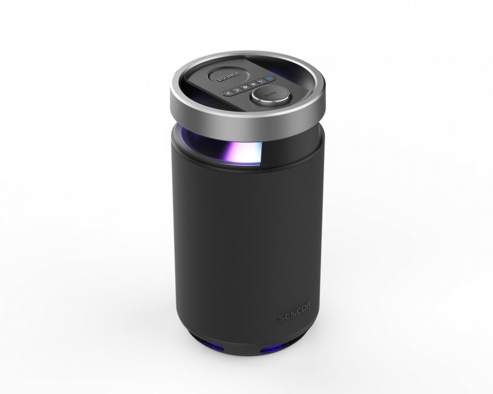 Bezdrátový reproduktor Sencor RESONEX LOUNGE Vlastnosti Voděodolný reproduktor se stupněm krytí IPX5 Kryt reproduktoru z prémiové tkaniny TWS (True Wireless Stereo) propojení dvou reproduktorů LED osvětlení reproduktoru a ambientní osvětlení 3 módy ekvalizéru Zvuk: Maximální výkon reproduktoru 130 W 5 reproduktorů (1 subwoofer, 4 širokopásmové) + 1 pasivní zářič Frekvenční odezva: 20 Hz – 19 kHz Celkové harmonické zkreslení: ≤ 5 % Vstupy: Bluetooth Audio 5.3 Audio vstup Aux (3,5 mm stereo konektor) Mic vstup (6.3 mm Jack) Přehrávání z USB Funkce powerbanky 5V/1A Ostatní: Vestavěná dobíjecí baterie: 21 000 mAh Li-Ion (77,7 Wh) Doba přehrávání až 13 hodin (při 50% hlasitosti) USB-C nabíjení (PD podpora) Doba nabíjení max. 4 hodiny Příslušenství: nabíjecí kabel, AUX kabel, uživatelská příručka Rozměry: 206 x 385 x 206 mm Hmotnost: 4,75 kg