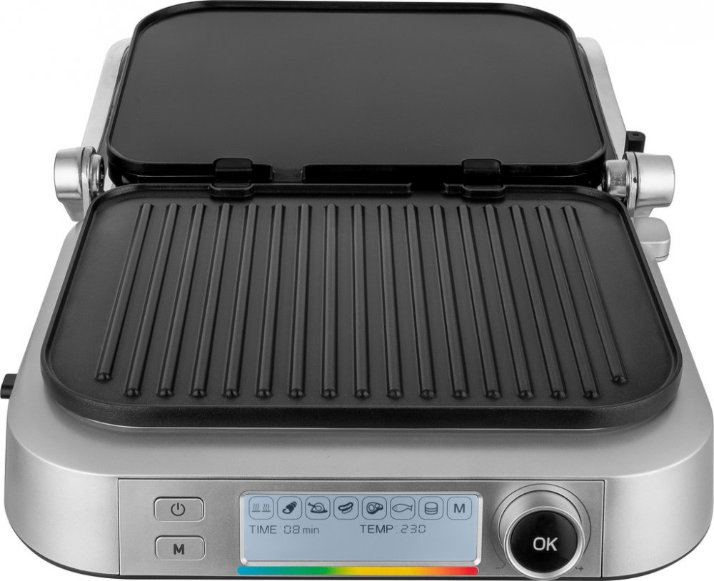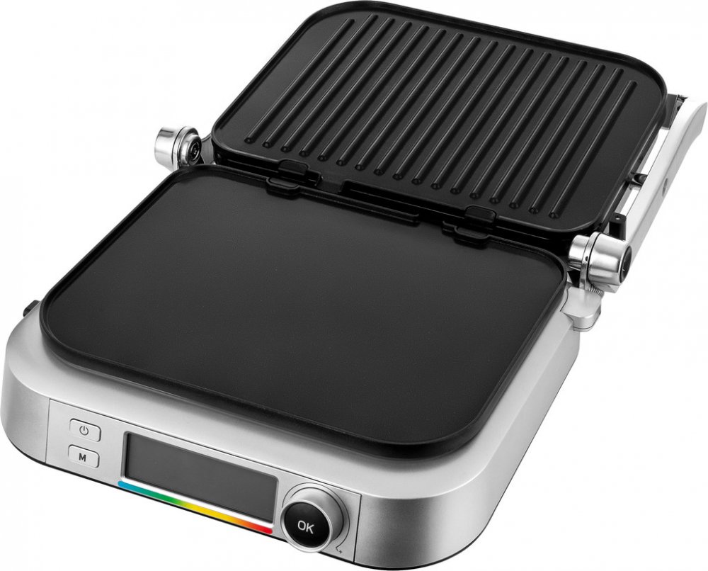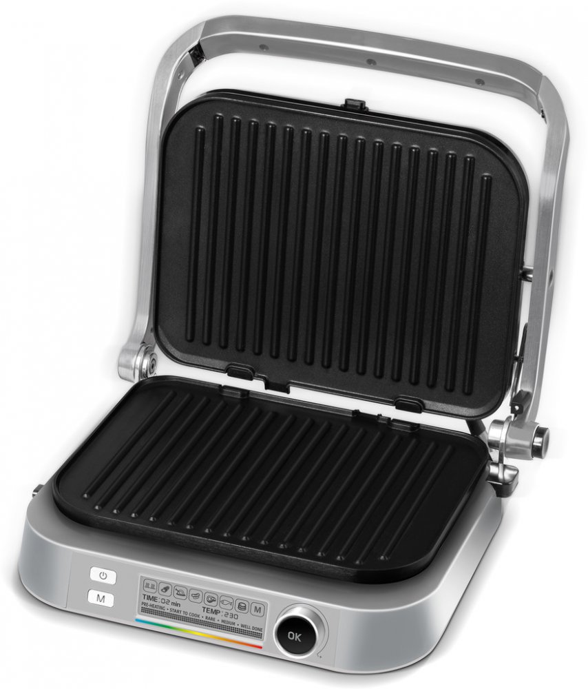 Inteligentni nastaveni 7 programu pomoci LCD displeje Automaticke senzory zarucuji perfektni vysledek Odnimatelne vymenitelne grilovaci desky Tepelne izolovany povrch Zdravy zpusob pripravy potravin Elegantni nerezove provedeni Prehledne a velmi intuitivni ovladani skrze LCD displejNeprilnave grilovaci desky