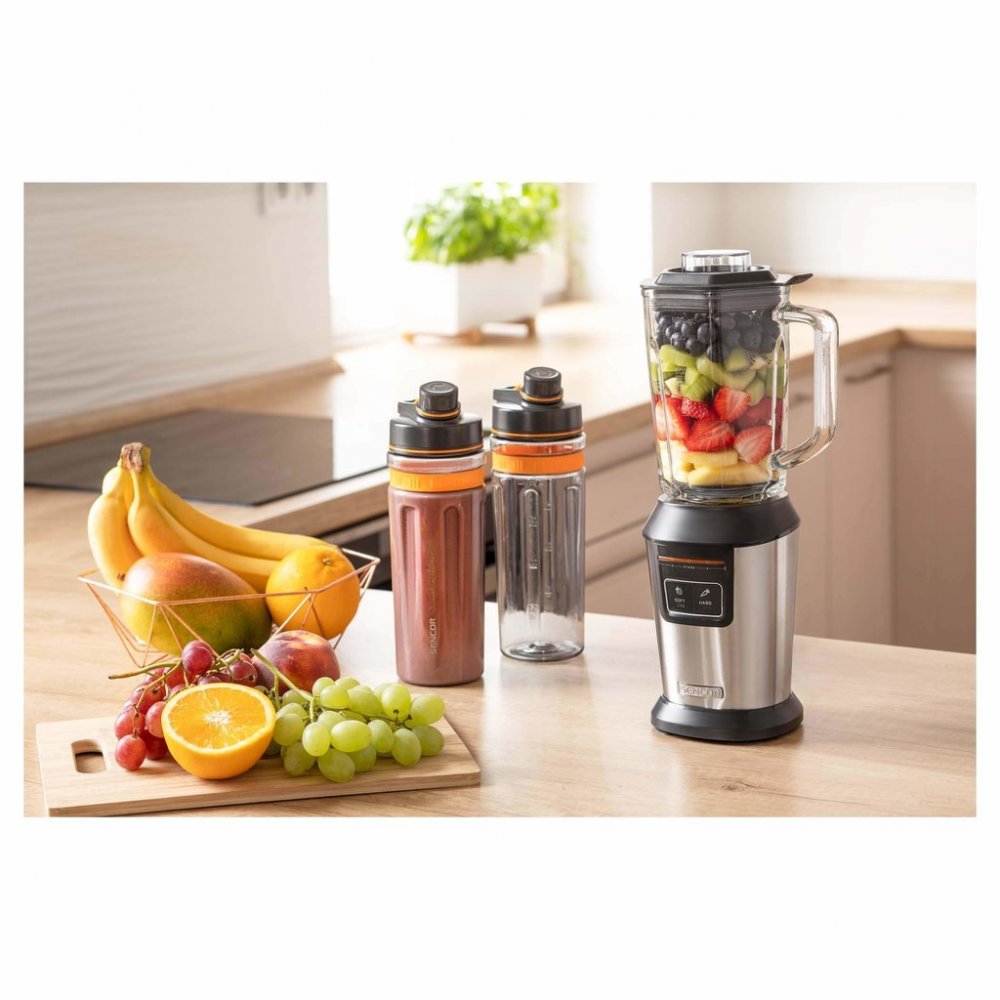 Součástí balení jsou dvě unikátní sportovní láhve o objemu 0,6 l, které jsou jako stvořené pro přenášení vašeho oblíbeného smoothie na trénink, do práce či na výlet. Láhve jsou vyrobeny z odolného materiálu TRITAN, který neobsahuje škodlivé látky jako BPA. Samozřejmostí je také skleněná nádoba mixéru s objemem 0,9 l pro přípravu větších porcí smoothie.