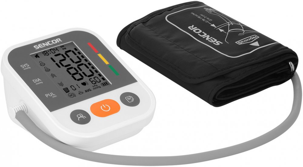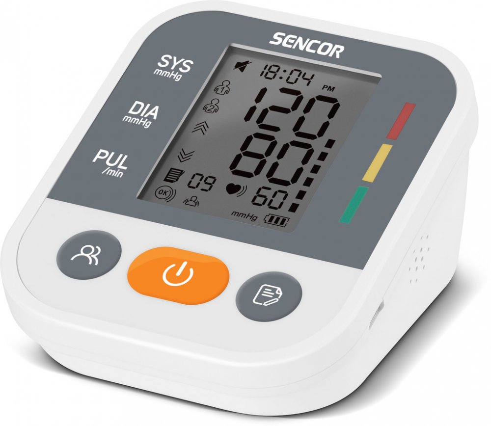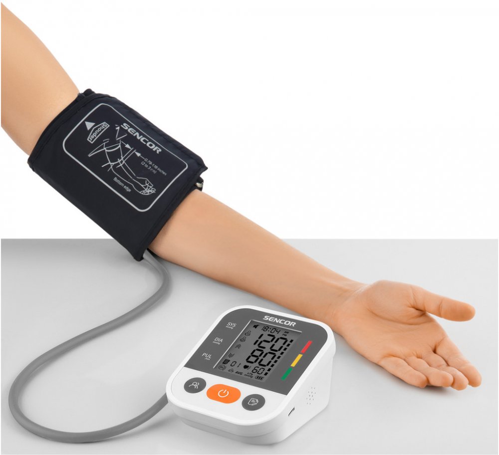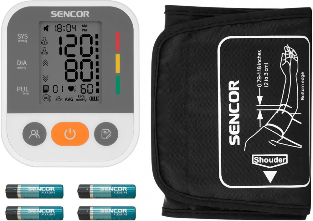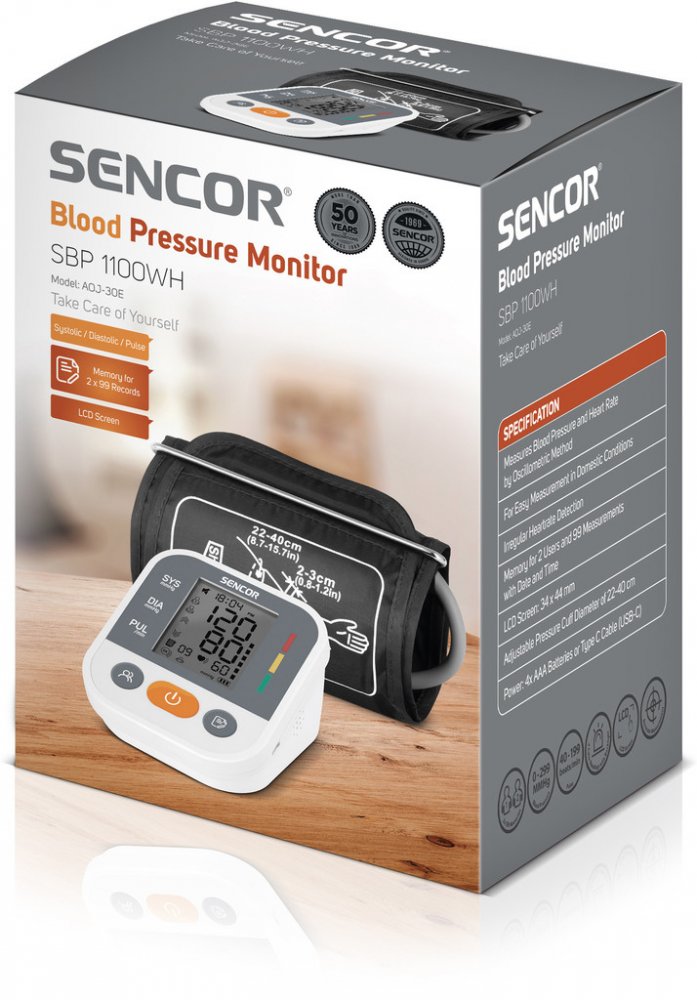 Displej, s nímž budete v obraze Součástí zařízení je displej o rozměrech 34 × 44 mm s velkými a přehledně uspořádanými číslicemi. Ty jsou ještě doplněné o barevnou stupnici značící, zda se jedná o nízký, normální, nebo vysoký tlak. Obsáhlá paměť Domácí tlakoměr Sencor umožňuje založení 2 uživatelských profilů. Ke každému z nich si pak do paměti uloží až 99 měření, takže budete mít k dispozici údaje o postupném vývoji svého zdravotního stavu. Po dosažení maximální paměti postupně nahrazuje starší hodnoty nejnovějšími měřeními. Data lze také zprůměrovat. Rozpozná včas srdeční arytmii V průběhu měření krevního tlaku dochází i ke sledování srdeční frekvence. Pokud zařízení detekuje srdeční arytmii, upozorní vás na to. Pravidelným měřením tak dosáhnete nejen větší přesnosti, ale budete mít také lepší přehled o svém zdraví a získaná data můžete v případě potřeby sdělit svému lékaři. Balení obsahuje: Tlakoměr včetně manžety