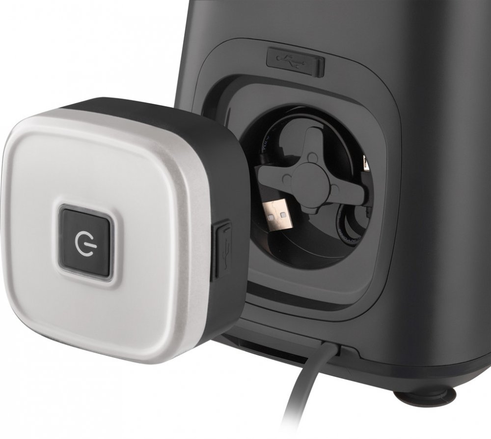 Stroj se spustí pouze ve správně sestavené poloze (bezpečnostní pojistka). Protiskluzová základna drží pevně na místě, snímatelné díly lze mýt v myčce. Mixér automaticky rozpozná nasazené příslušenství a přizpůsobí režim.