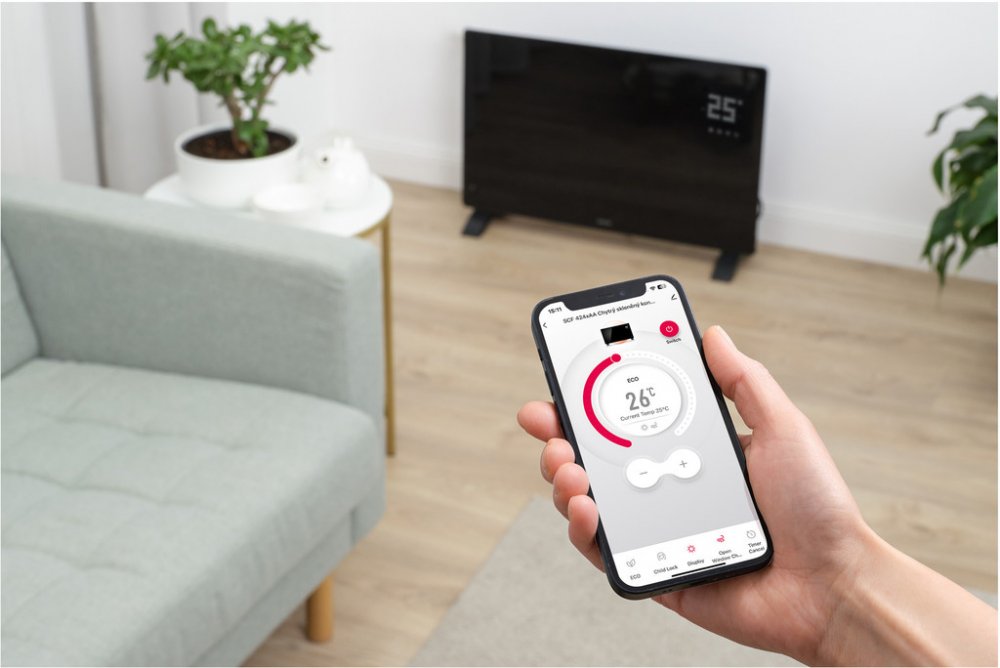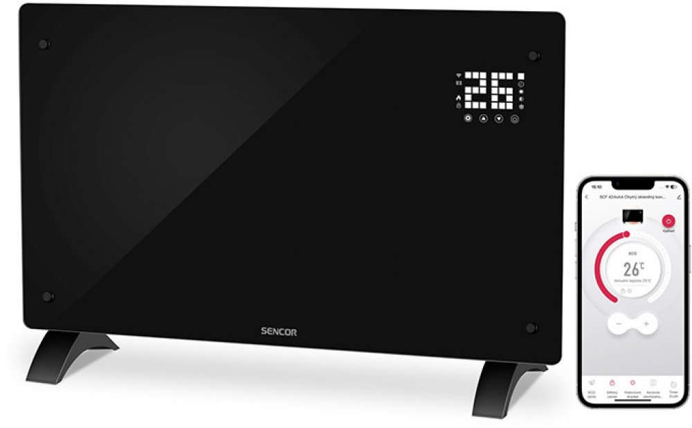 Nastavení teploty je možné třemi způsoby – pomocí dotykového LCD displeje na tělese konvektoru, přiloženým dálkovým ovládáním nebo prostřednictvím mobilní aplikace SENCOR HOME s podporou Wi-Fi a Bluetooth. Aplikace umožňuje kontrolu a řízení topení odkudkoli, sledování aktuální teploty a vytváření týdenních scénářů pro automatické topení podle denního režimu.