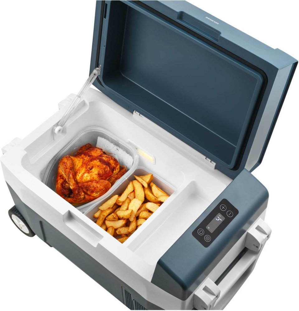 Kompresorová autochladnička SENCOR SCM 3501BL Vnitřní nominální objem 35 l Funkce chlazení až do -18 °C i ohřevu až do 50 °C 3 možnosti napájení (AC adaptér 100-240 V / 12 V z automobilové zástrčky) Hlavní přednosti 35l výkonná kompresorová autochladnička, která chladí, mrazí a umí i ohřívat. Na party pod širým nebem, na cesty, mimo civilizaci… …je spousta situací, kdy potřebujete převážet nápoje a potraviny o přitom udržet jejich správnou teplotu. A tahle velká kompresorová autochladnička pojme spoustu dobrot. Pod jedním víkem nabízí dvě oddělené komory. Větší, 27 litrovou mrazicí a menší, 8 litrovou chladicí. Díky výkonnému kompresoru pro chlazení a účinné izolaci dokáže svůj vnitřní prostor vychladit na teploty v rozmezí 20 až -18 °C, přesně podle vámi zvoleného nastavení. Takže se dají bezpečně převážet i mražené potraviny. A i když si ji spíš pořídíte kvůli chlazení, určitě se bude hodit, že kromě chladu, zvládne svůj obsah i ohřívat. Na ovládacím panelu chlazení vyměníte za ohřev, na displeji se místo vločky rozsvítí ikonka ohřevu. Pak jen zvolíte cílovou teplotu v rozsahu 30-50 °C. Sama o sobě váží zhruba 15,5 kilogramů. Co teprve, když ji naplníte dobrotami. Proto jsou pro snadnou manipulaci důležitá 2 madla / pohodlné rukojeti a pár solidních pojezdových koleček. Díky tomu ji snadno naložíte do auta a dostanete ji bez nesnází na jakékoli místo - při odpočinku u rybaření, na grilovačku, na dovolenou pod stanem, na oslavu za horkého letního dne, zkrátka všude, kde se objemná a opravdu výkonná autochladnička bude hodit. Autochladnička je vybavena 12V napájením do cigaretové zásuvky v autě i AC adaptérem pro napájení z běžné elektrické sítě. A určitě je třeba ještě zmínit drobné, o to možná užitečnější vychytávky. Víko má vzpěru s pojistkou, která jej udrží otevřené pro snadnější manipulaci s obsahem chladicího boxu. V noci přijde vhod vnitřní lampička. Zkrátka tohle je vlastně klasická domácí lednička. Jen v mobilním provedení, aby vám posloužila na cestách a během vašich dobrodružství. Vlastnosti - Chladí i ohřívá - Vnitřní objem: 35 l - Využitelný objem: 34 l - Chladicí a mrazicí prostor: 8 l a 27 l - Stylový design, ideální pro použití doma i v přírodě - Velká rukojeť pro snadné přenášení na piknik a kempování - 2 možnosti napájení (AC adaptér 100-240 V / DC 12 V - 12 V auto napájení) - Chladicí výkon: 70 W / topný výkon: 40 W - Nastavitelný rozsah chlazení -18 °C až 20 °C - Nastavitelný rozsah ohřívání 30 až 50 °C - Izolace: Cyklopentan - Chladicí médium: R1234yf / 28 g - Hluk: ≤50 dB(A) / hluk pozadí ≤25 dB(A) - Rozměry (š × v × h): 35,6 × 41,5 × 65,5 cm - Hmotnost: 15,5 kg Elektrické vlastnosti - Napětí: 100-240 V 50-60 Hz (výstupní napětí 13,5 V) // 12 V / 24 V 6,0 A - Jmenovitý příkon: AC (výstup 6,5 A) 2,5 A / DC 6 A - Spínání napájení při 12 V DC nebo 24 V DC o Vypnutí 12V stejnosměrného proudu: pod 11 V nebo nad 17 V o Náběh 12V stejnosměrného proudu: 11±0.3 až17 V o Vypnutí 24V stejnosměrného proudu: Pod 21 V nebo nad 30 V o Náběh 24V stejnosměrného proudu: 21 až 30 V Rozměry a hmotnost - Výška: 41,5 cm - Šířka: 35,6 cm - Hloubka: 65,5 cm - Hmotnost: 15,5 kg - Délka kabelu 12 V: 2 m - Délka kabelu s adaptérem: 1,15 m - Délka napájecího kabelu: 1,5 m - Barva: modrá s bílou