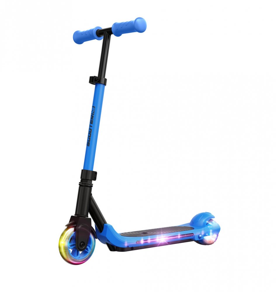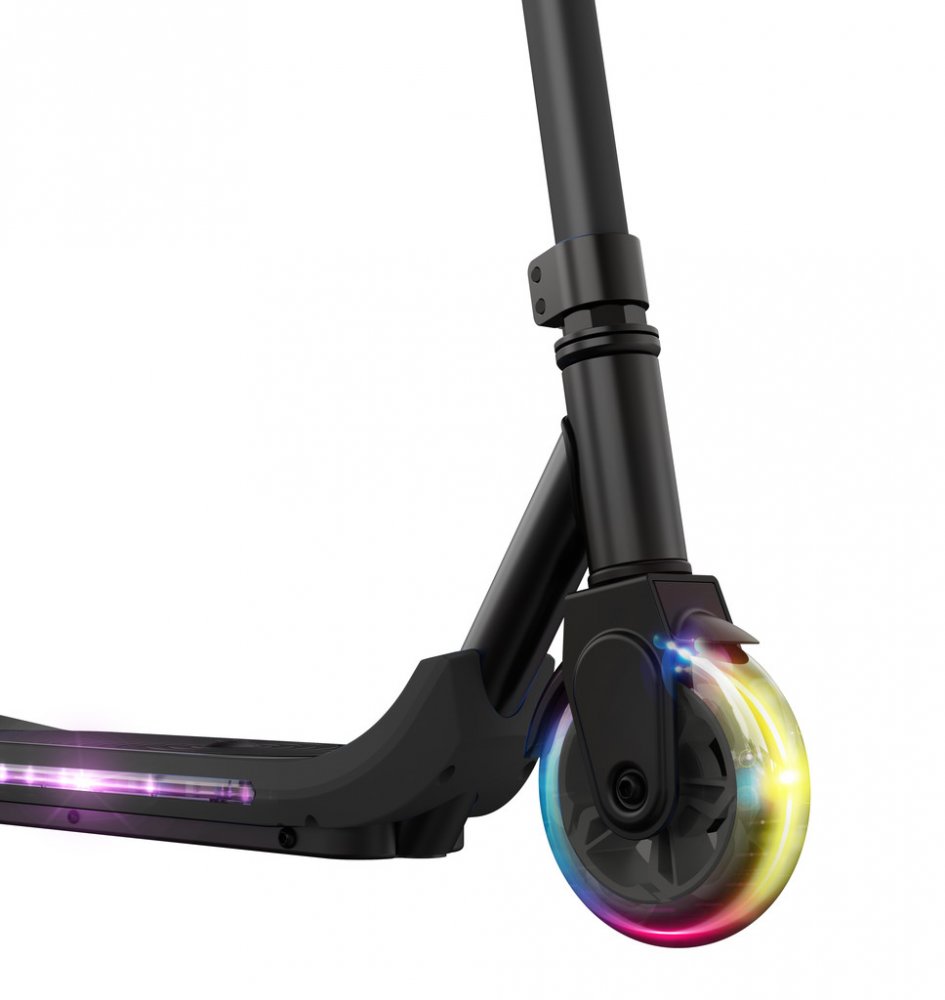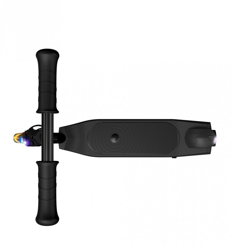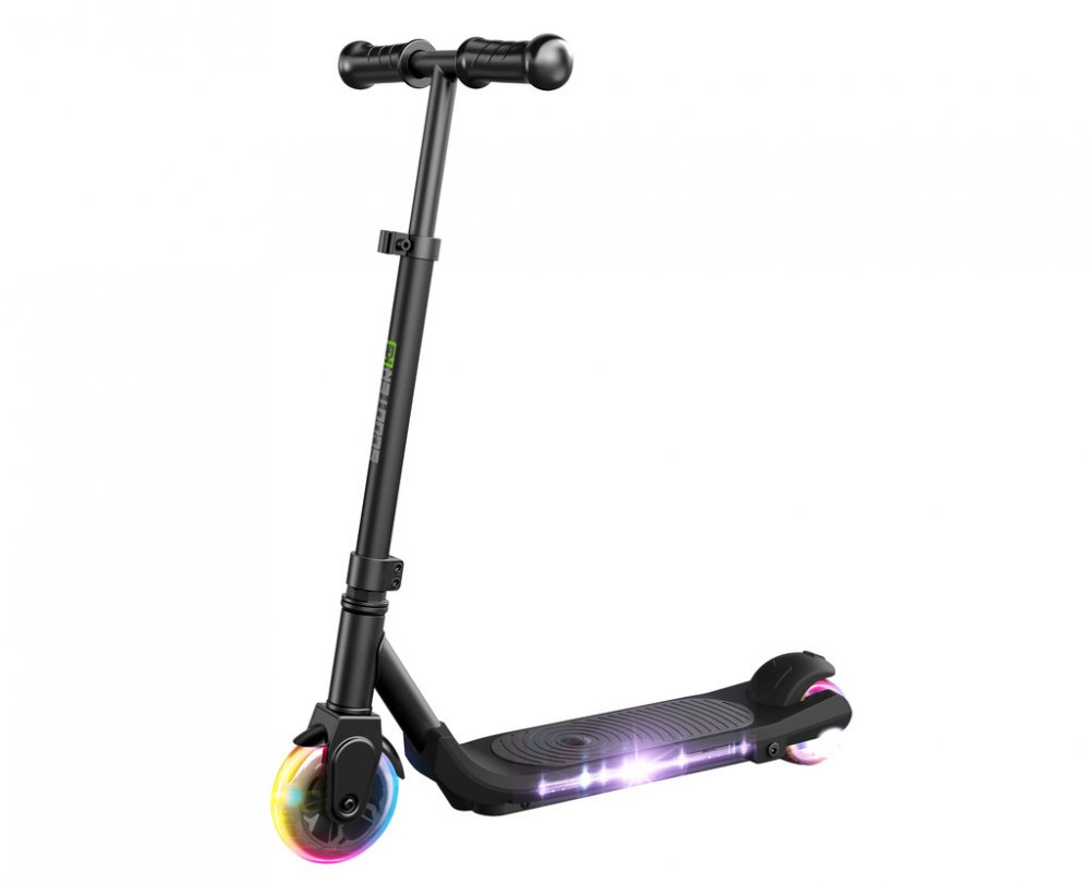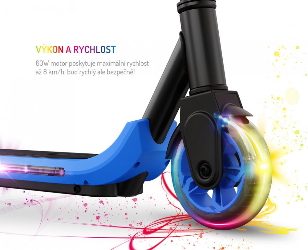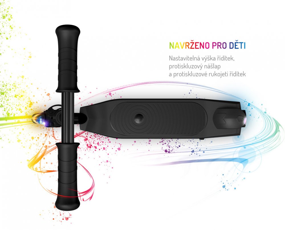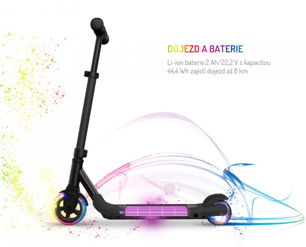 Elektrická koloběžka pro děti, která kombinuje lehkost a odolnost pro bezpečné a zábavné jízdy. Nabízí nastavitelná řídítka pro pohodlné ovládání, barevné LED osvětlení pro stylovou jízdu a gummová kola pro lepší stabilitu a bezpečnost. Přední úzké kolo o průměru 5" a zadní široké 3,5" kolo zajišťují lepší rovnováhu. Nožní brzda na zadním kole jako u klasických koloběžek pro snadné a rychlé zastav...