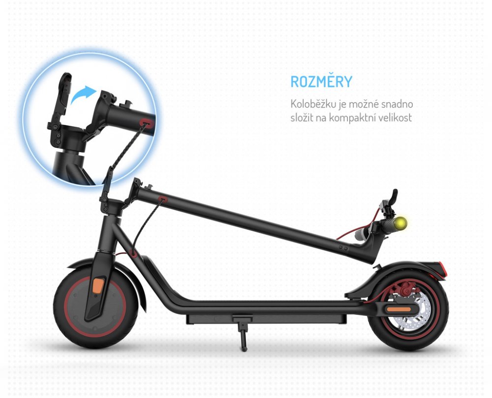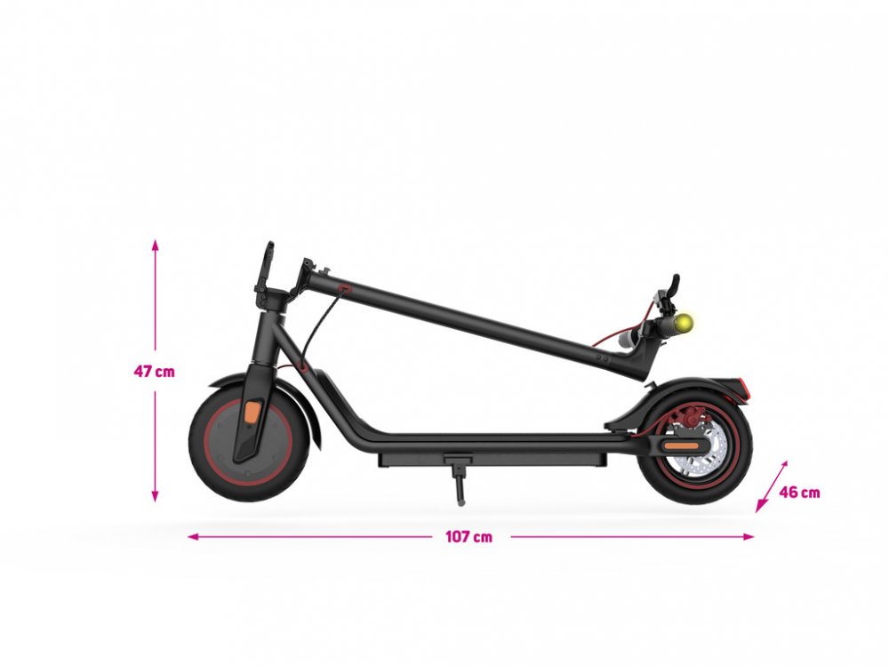 Koloběžka je navržena tak, aby byla co nejkompaktnější. Složená měří pouze 107 × 49 × 47 cm, což zaručuje snadné uložení a přenášení. I při rozměrech ideálních pro městský život nabízí dostatečnou stabilitu a pohodlí při jízdě.