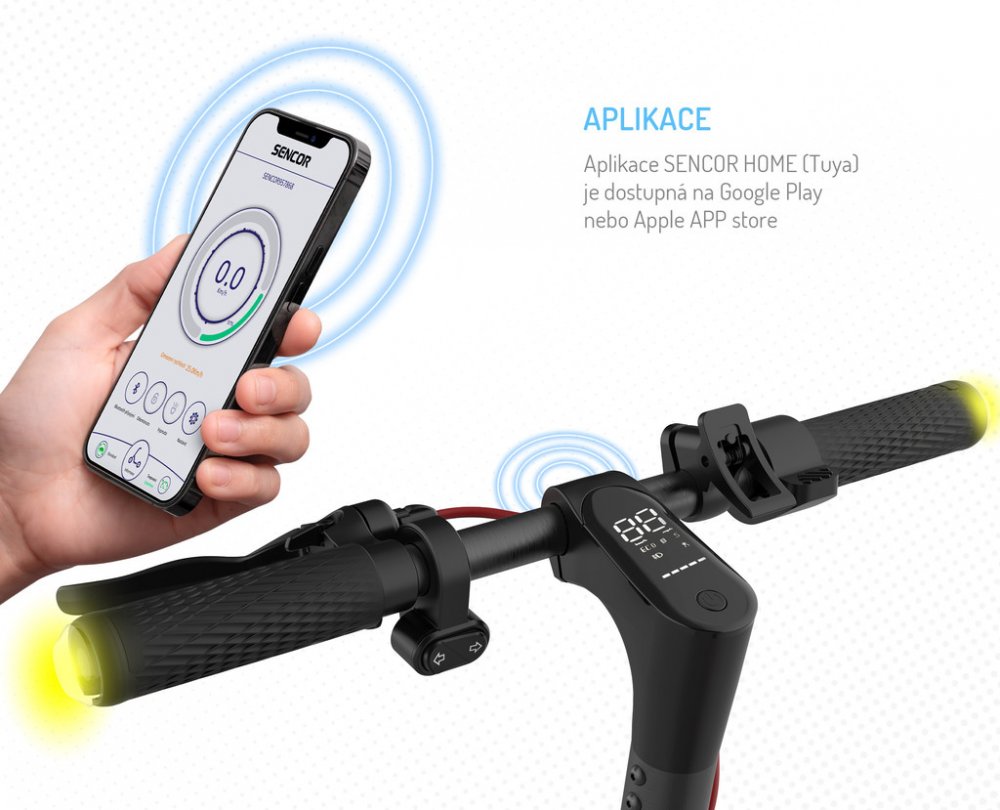 Aplikace SENCOR HOME vám umožní sledovat všechny klíčové informace o koloběžce přímo na vašem telefonu. Dostupná pro iOS a Android, aplikace poskytuje přehled o režimu jízdy, rychlosti, stavu baterie a dalších parametrech. Navíc díky Bluetooth můžete koloběžku zamknout a zabezpečit ji přímo z aplikace.
