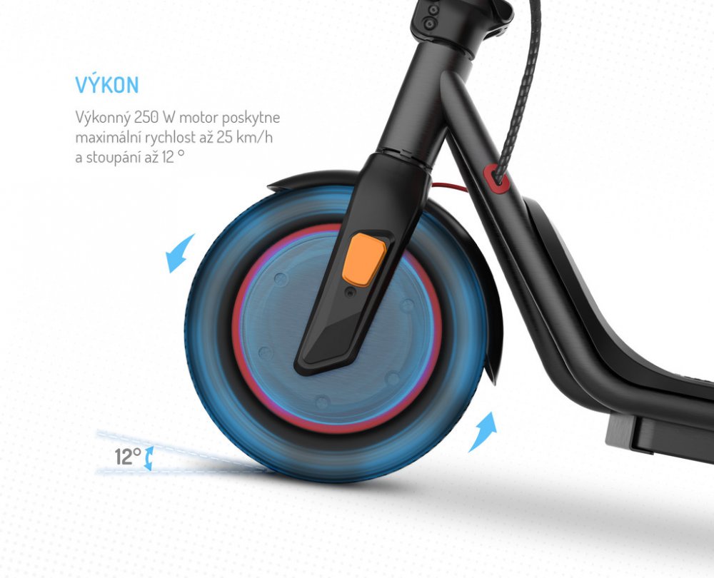 Silniční elektrická koloběžka je vybavena motorem o výkonu 250 W, který zajišťuje plynulou a spolehlivou jízdu. S maximální rychlostí až 25 km/h v režimu SPORT si užijete rychlé a pohodlné cestování městem. Koloběžka nabízí různé režimy jízdy, které přizpůsobí výkon vašim potřebám, ať už jedete do práce, na výlet nebo jen tak pro radost.