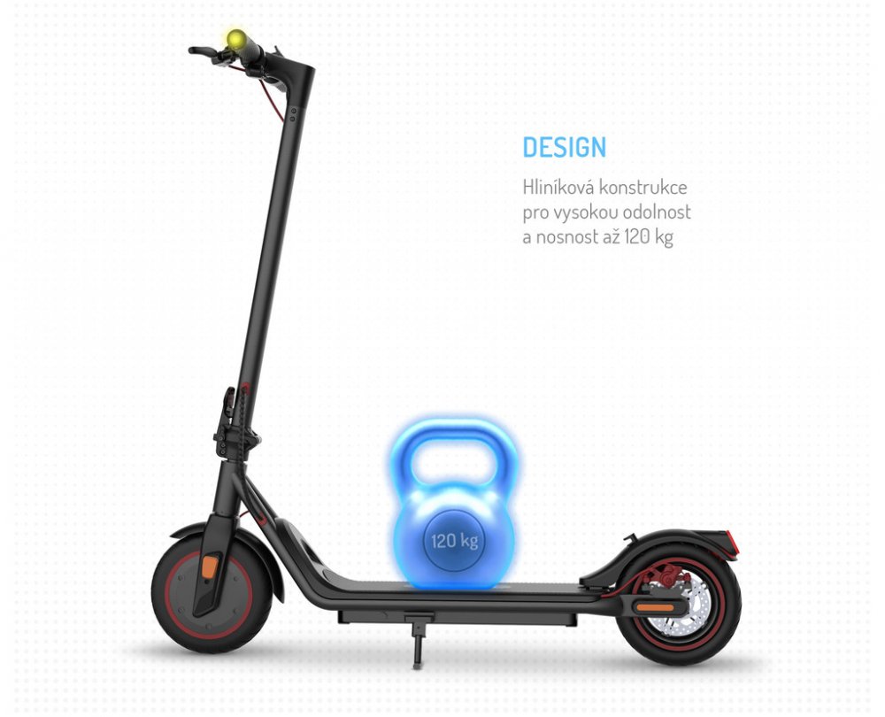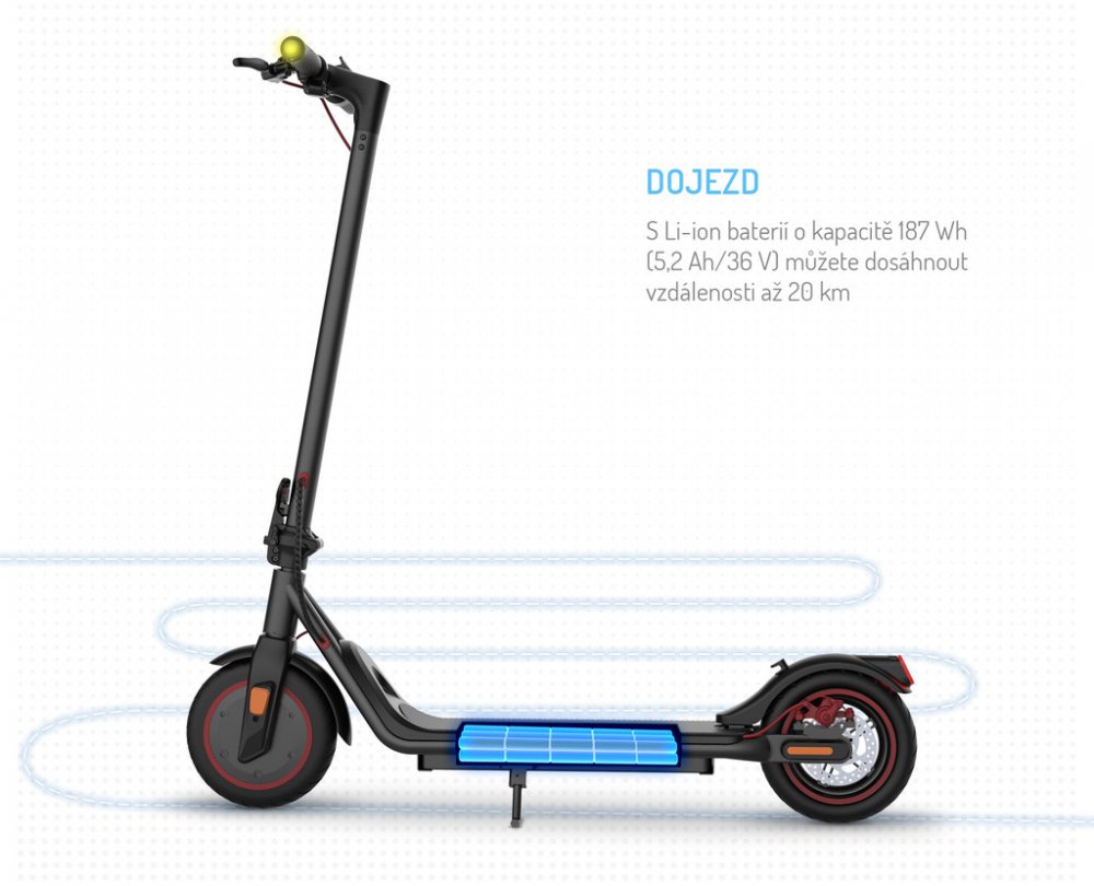 Elektrická koloběžka - výkon 250 W, maximální rychlost 25 km/h, dojezd až 20 km, kapacita baterie 5,2 Ah, skládací konstrukce, nosnost 120 kg, hmotnost 12,5 kg