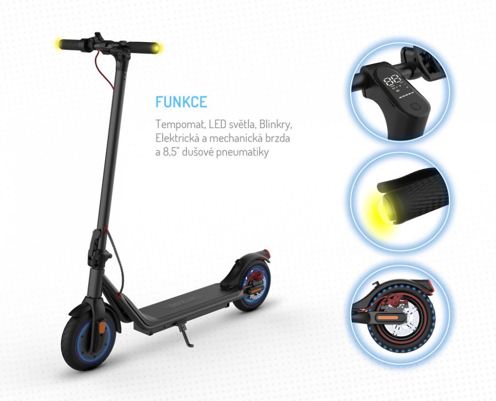 Koloběžka je vybavena LED displejem, který zobrazuje informace o rychlosti, módu, stavu baterie a dalších funkcích. Pro bezpečnost je vybavena blinkry pro indikaci odbočování a duálním brzdným systémem, který zahrnuje kotoučovou a elektrickou brzdu pro maximální kontrolu při jízdě.
