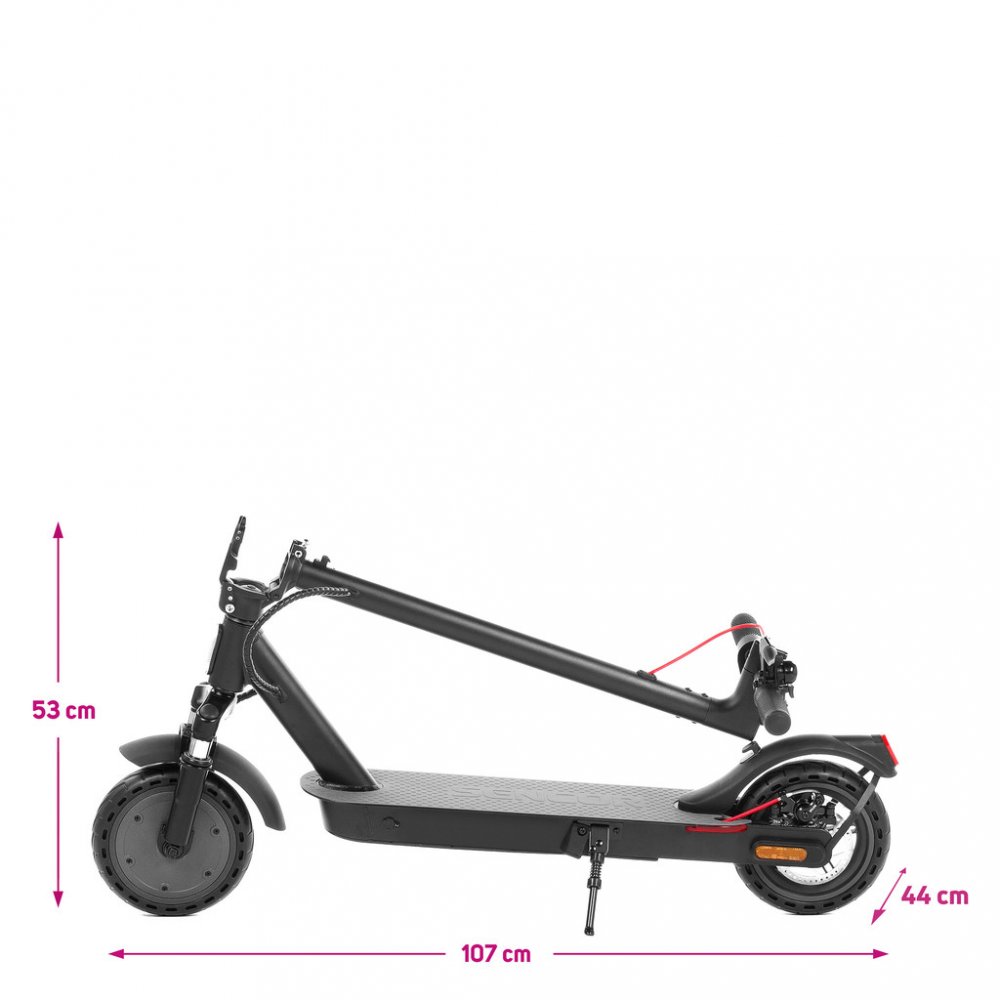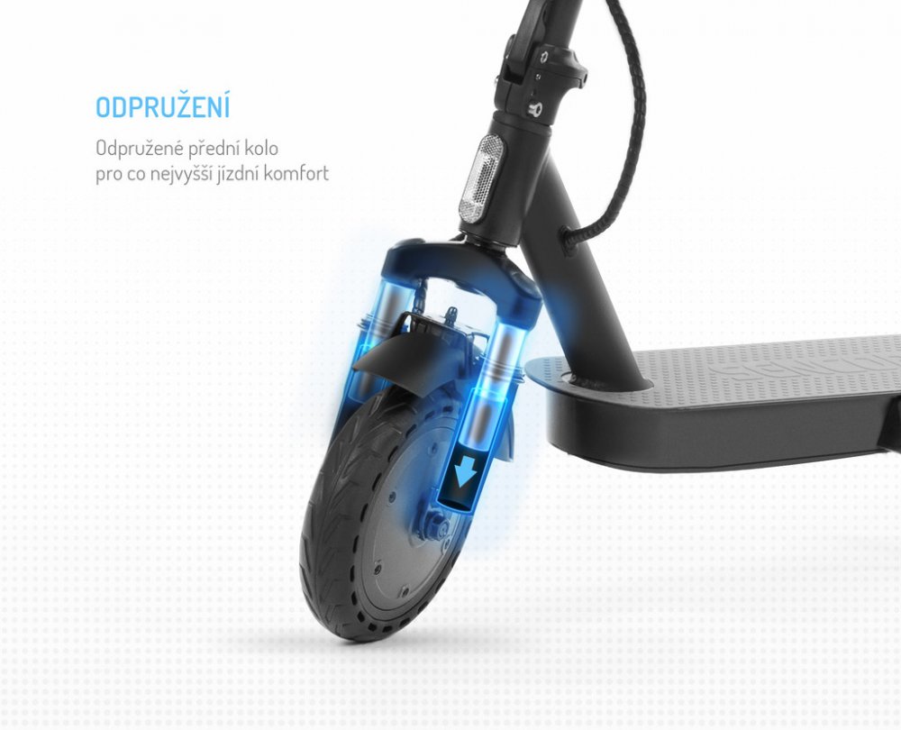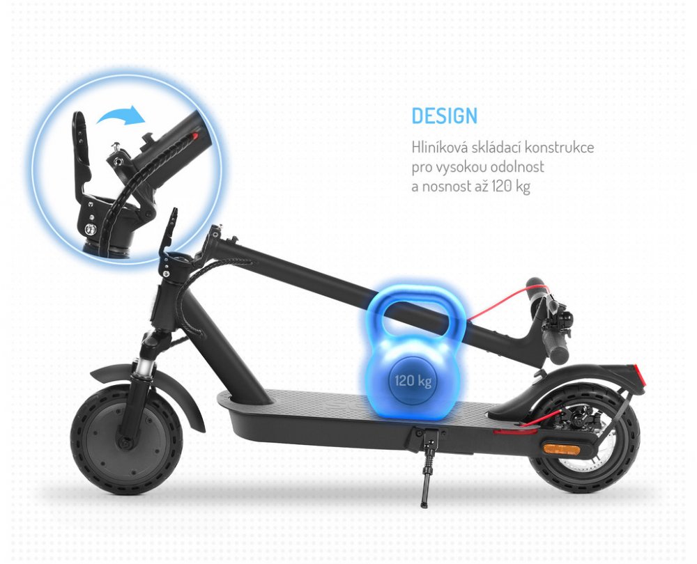 Koloběžka má hliníkovou skládací konstrukci pro jednoduché a rychlé složení, což uvítáte především při přepravě koloběžky na různá místa. Má odpružené přední kolo, takže se nemusíte s koloběžkou bát vyjet ani do náročnějšího terénu.