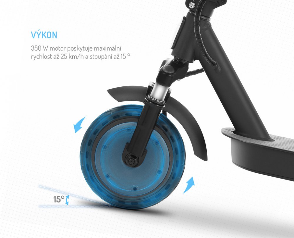 Koloběžka je poháněna motorem o výkonu 350 W, díky kterému je schopná vyvinou rychlost až 25 km/h. A to už je panečku jízda!