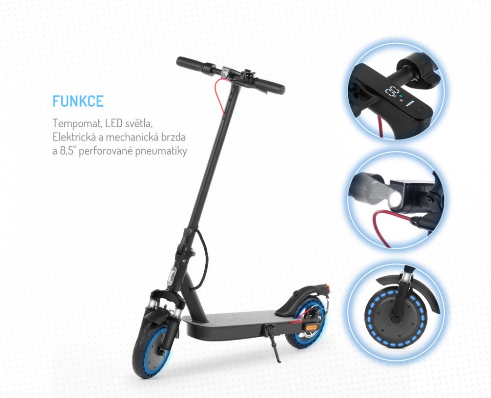 Elektrická koloběžka vhodná pro pokročilejší jezdce i pro začátečníky. 8,5“ perforované pneumatiky, odpružení předního kola, elektrická a mechanická brzda, LED osvětlení, LED displej (mód, rychlost, baterie, osvětlení, Bluetooth). Motor o výkonu 350 W. Maximální rychlost 25 km/h. Několik jízdních režimů: walk až 6 km/h, eco až 10 km/h, drive až 20 km/h, sport až 25 km/h. Dojezd až 30 km. Stoupání 15°. Nosnost až 120 kg. Baterie 7500 mAh. Aplikace Sencor Scooter dostupná na Google Play a app Store (funkce uzamknutí koloběžky pomocí aplikace).