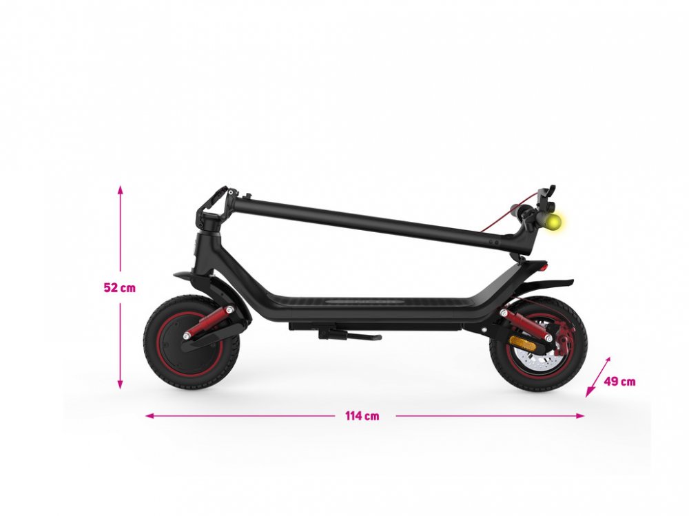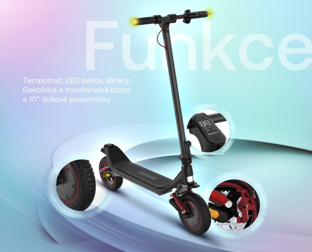 Pro bezpečnost je koloběžka vybavena LED osvětlením vpředu a vzadu a LED displejem, který zobrazuje všechny potřebné informace o aktuálním módu, rychlosti, stavu baterie a připojení Bluetooth. Blinkry pro indikaci odbočování vám usnadní bezpečnou jízdu ve městě. Dušové komfortní pneumatiky o velikosti 10 palců zajistí pohodlnou a stabilní jízdu, a kotoučová brzda poskytuje efektivní zastavení.