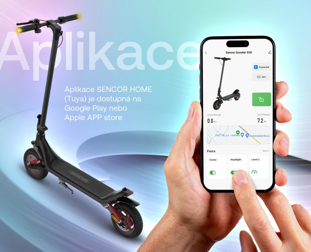 Díký baterii o kapacitě 360 Wh koloběžka nabízí dojezd až 30 km na jedno nabití, což vám umožní projet delší vzdálenosti bez obav. K její správě vám poslouží aplikace SENCOR HOME, která je k dispozici na Google Play a v App Store, a poskytne vám informace o výkonu, rychlosti, stavu baterie, osvětlení a dalších funkcích.
