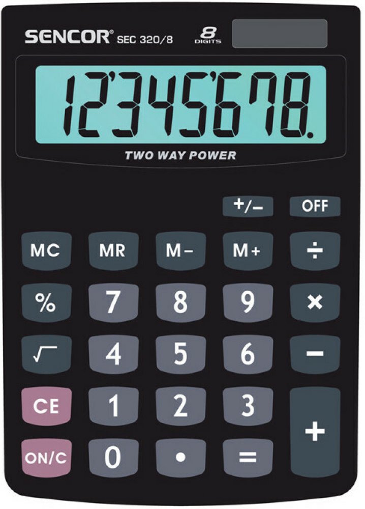 stolní kalkulačka s velkým displejem, výpočet procent, výpočet zisku, opravné tlačítko zadání, 4 tlačítková paměť, plastiková tlačítka, nezávislá paměť, napájení: duální solár/bateriové, rozměry: 143 x 102 x 29 mm, hmotnost: SEC 320/8 100 g, SEC 340/12 100 g