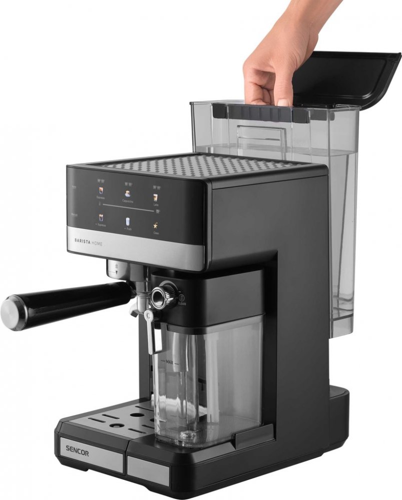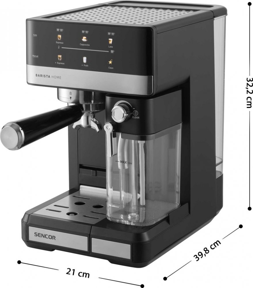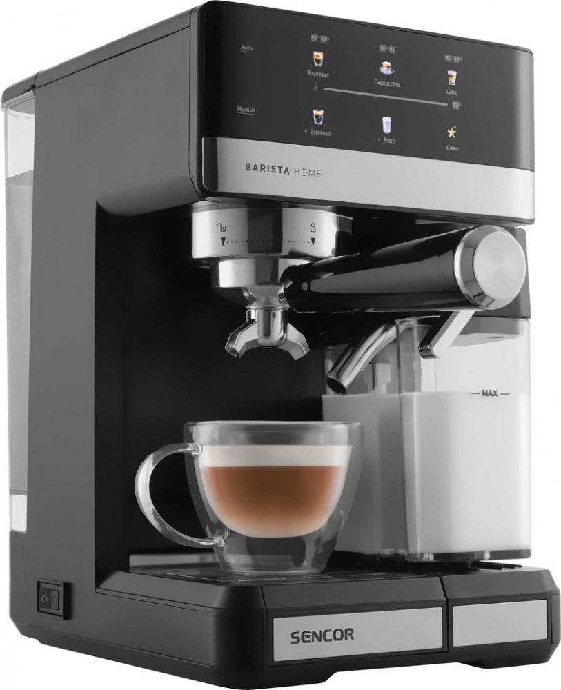 Sencor SES 4060BK kombinuje klasickou přípravu espressa s komfortem automatického napěňování mléka. Díky tlaku 20 barů, systému Thermoblock a přehlednému dotykovému displeji připravíte espresso, cappuccino nebo latte macchiato na profesionální úrovni přímo u vás doma.