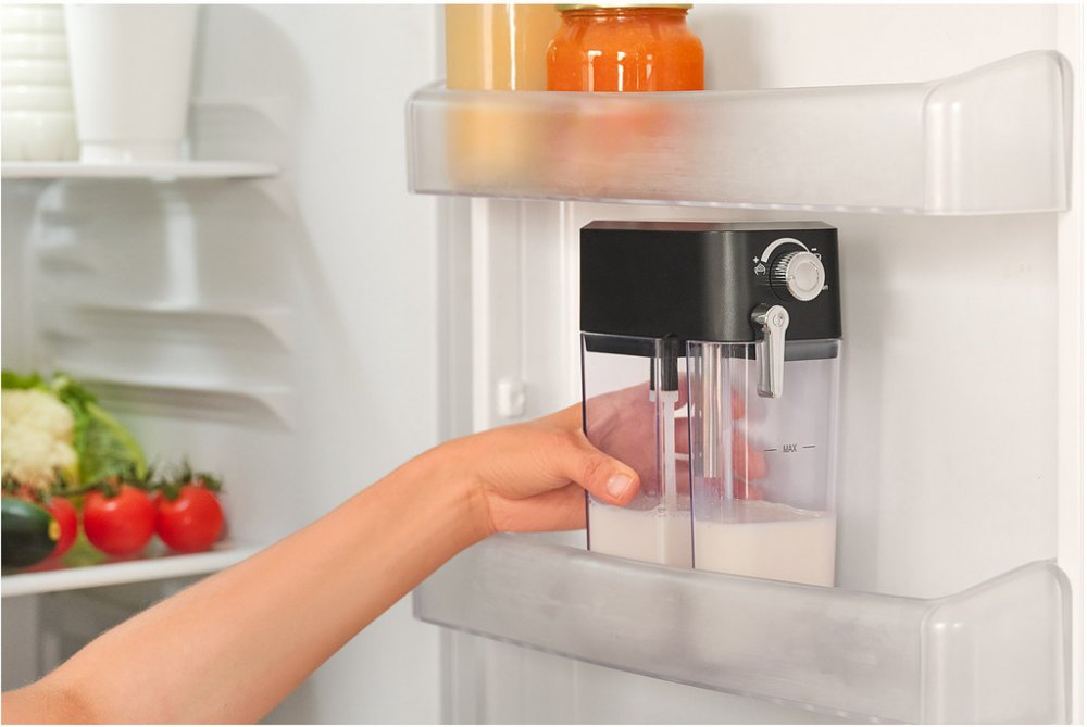 Průhledná nádoba na mléko s odnímatelným napěňovačem zajišťuje snadné čištění