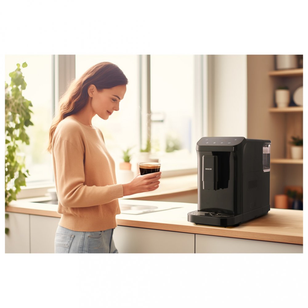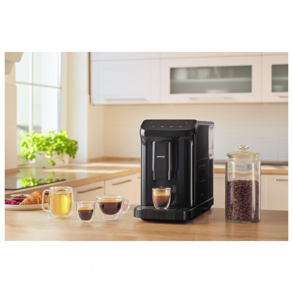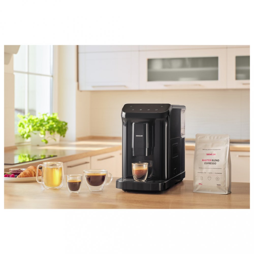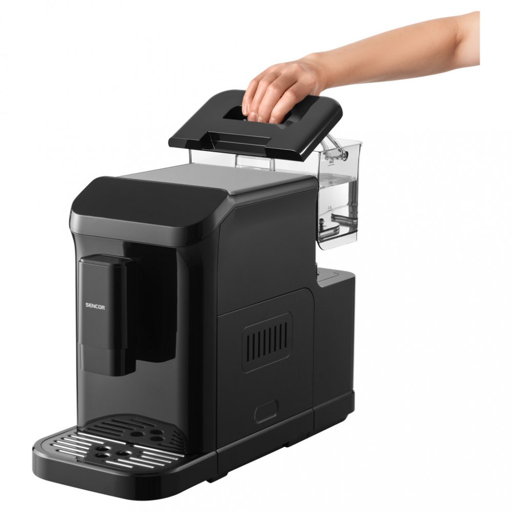 Sencor černá dotykové 20 bar 1.5 l 200 g ikony LED s nádržkou na vodu 1350 W ocelové 15 8.7 kg 32 cm 18.8 cm 43.5 cm se snadnou údržbou pro 1-2 osoby kompaktní 2 standardní