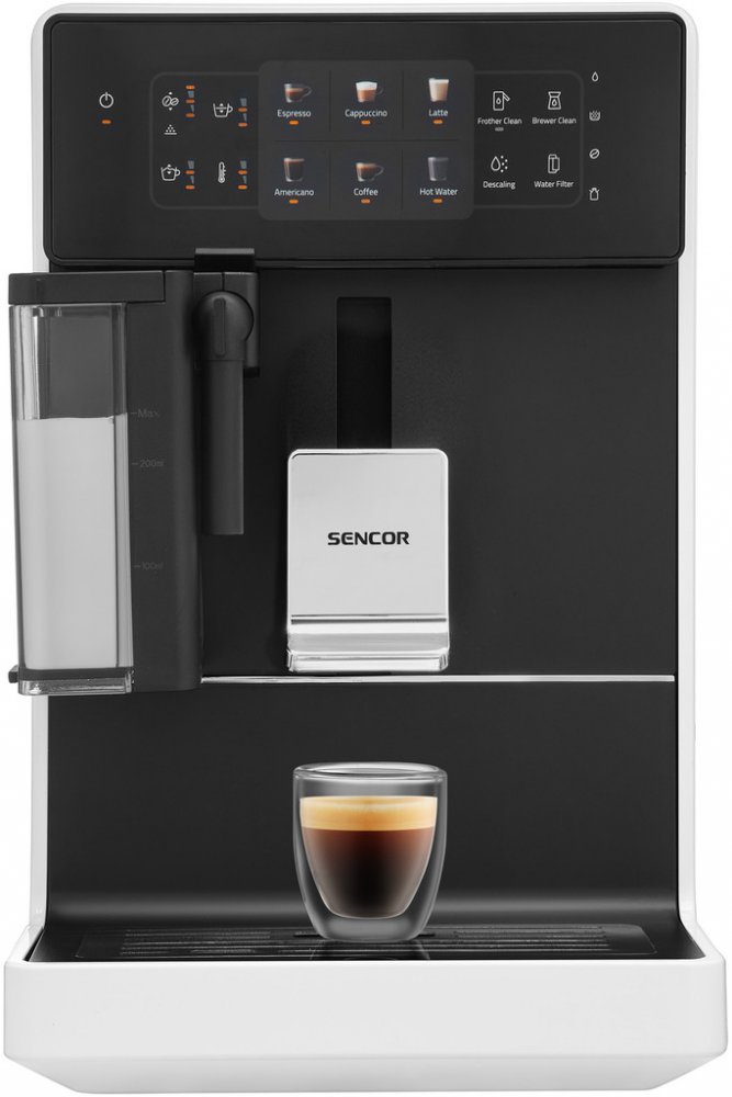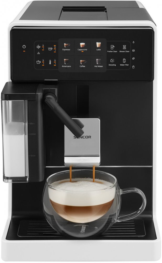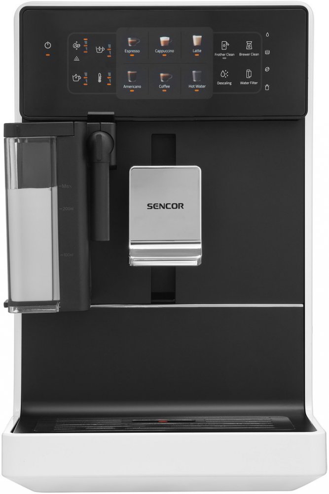 Sencor bílá/černá Dotykové s integrovanou nádobou na mléko 19 bar 1.3 l 200 g 250 ml dotykový displej s nádržkou na vodu 1400 W ocelové 9 9.5 kg 34 cm 21.5 cm 45.5 cm 4 standardní pro 1-2 osoby kompaktní