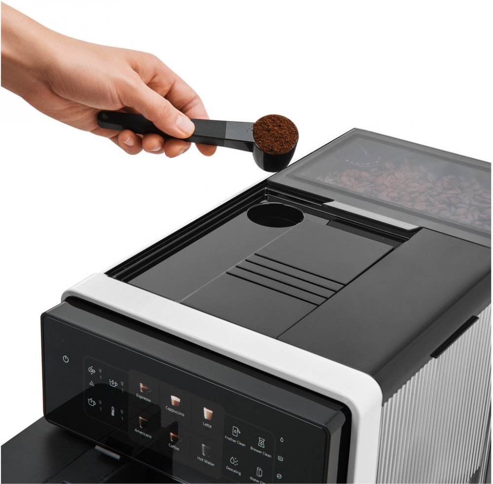 Na přehledném panelu si snadno nastavíte sílu, teplotu a velikost nápoje. Kávovar zvládá jak zrnkovou, tak i předem mletou kávu (např. bezkofeinovou). Thermoblock hlídá stabilní teplotu vody a funkce horké vody se hodí pro americano nebo čaj. Samozřejmostí je automatický proplach a programy odvápnění, které zjednoduší údržbu a prodlouží životnost přístroje.