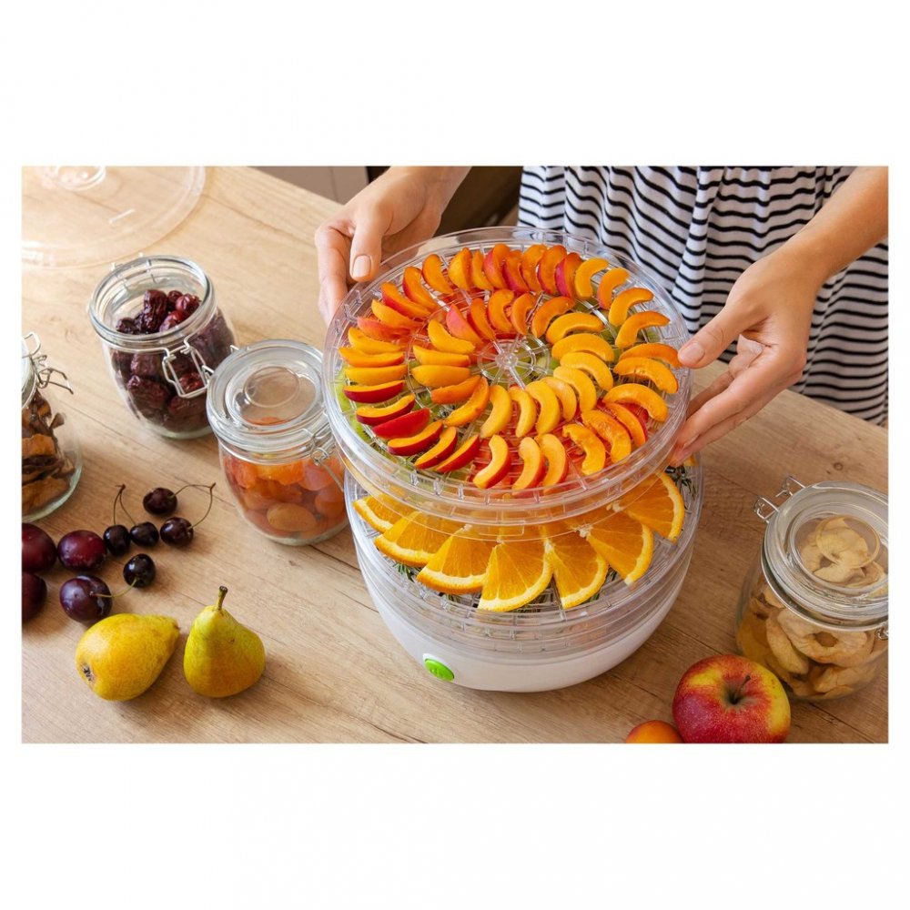Sušička potravin vhodná k přípravě například: - sušeného ovoce (křížal, švestek, meruněk, banánů atp.) - rozinek - sušené zeleniny do polévek - sušených rajčat - sušených bylinek - bylinkových čajů (máta, lipový květ, heřmánek atp.) - sušených hub do polévek a pokrmů - sušených pomerančů na dekorace - sušených dýňových semínek - sušených okvětních lístků na vonné směsi - sušeného masa - sušených r...
