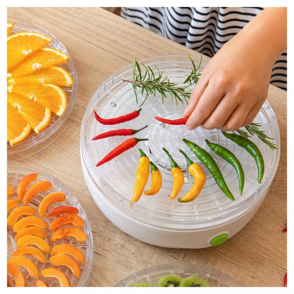 Sušička potravin vhodná k přípravě například: - sušeného ovoce (křížal, švestek, meruněk, banánů atp.) - rozinek - sušené zeleniny do polévek - sušených rajčat - sušených bylinek - bylinkových čajů (máta, lipový květ, heřmánek atp.) - sušených hub do polévek a pokrmů - sušených pomerančů na dekorace - sušených dýňových semínek - sušených okvětních lístků na vonné směsi - sušeného masa - sušených ryb 5 sušících sít v základní výbavě Úspora místa při provozu s menším počtem sít (možno již s jedním sítem) Průměr sušícího síta: 23 cm Užitná výška patra: 2,5 cm Integrovaný ventilátor napomáhá rovnoměrnému sušení na všech patrech Design mřížky sušících sít zabraňuje vzniku plísní a optimalizuje proudění vzduchu Průhledné víko a síta umožňují okamžitou vizuální kontrolu nad stavem sušení Sušící síta i víko je možno mýt v myčce nádobí Tepelná pojistka proti přehřátí Příkon: 250 W Délka přívodního kabelu: 0,9 m Rozměry (šířka × hloubka × výška): 230 × 230 × 190/230 mm Hmotnost: 1,3 kg Napětí a kmitočet: 220-240 V, 50 Hz