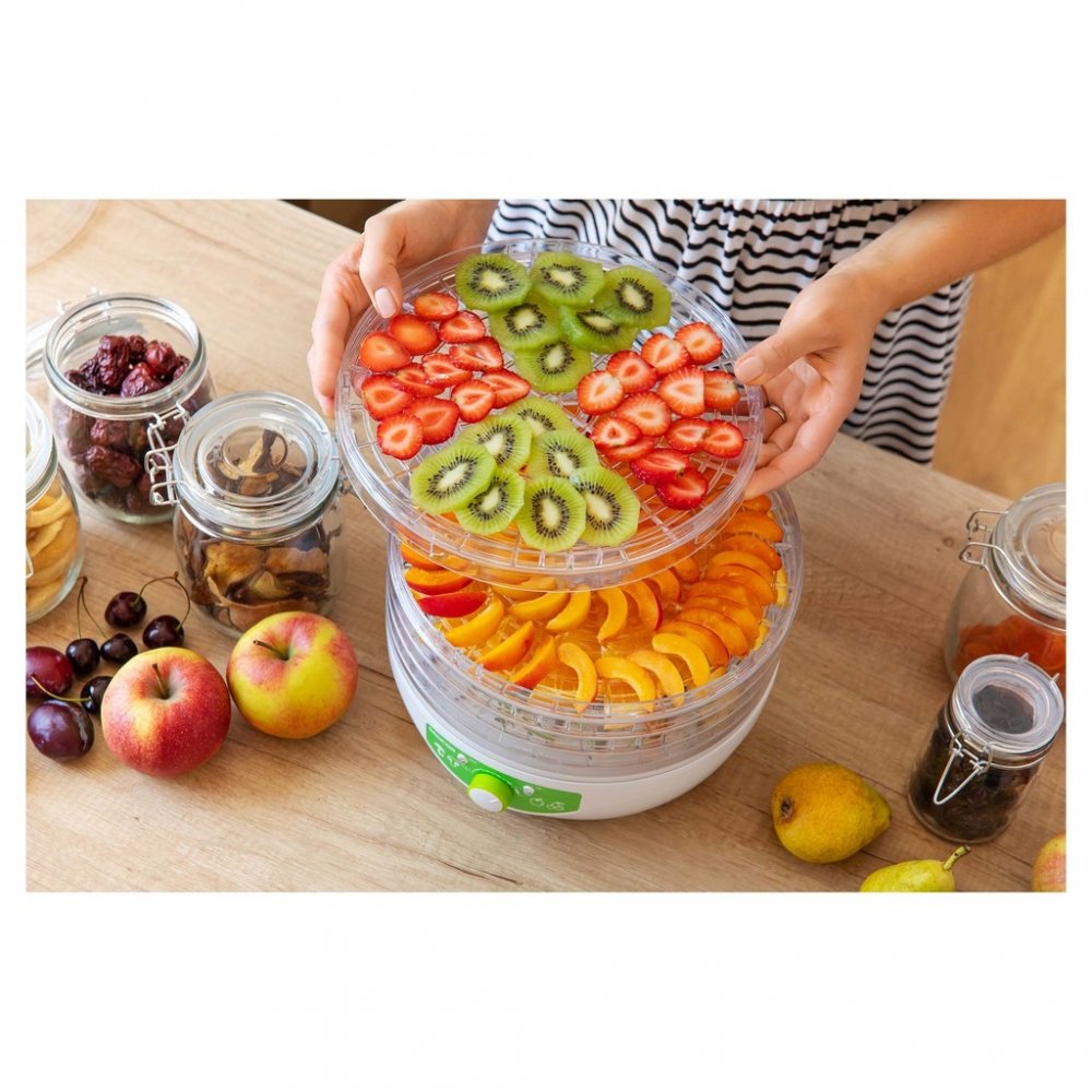 Sušička potravin vhodná k přípravě například: - sušeného ovoce (křížal, švestek, meruněk, banánů atp.) - rozinek - sušené zeleniny do polévek - sušených rajčat - sušených bylinek -bylinkových čajů (máta, lipový květ, heřmánek atp.) - sušených hub do polévek a pokrmů - sušených pomerančů na dekorace - sušených dýňových semínek - sušených okvětních lístků na vonné směsi - sušeného masa - sušených ryb Regulace teploty 35-80 °C 5 sušících sít v základní výbavě Úspora místa při provozu s menším počtem sít (možno již s jedním sítem) Průměr sušícího síta: 23 cm Užitná výška patra: 1,3 cm Integrovaný ventilátor napomáhá rovnoměrnému sušení na všech patrech Design mřížky sušících sít zabraňuje vzniku plísní a optimalizuje proudění vzduchu Průhledné víko a síta umožňují okamžitou vizuální kontrolu nad stavem sušení Sušící síta i víko je možno mýt v myčce nádobí Tepelná pojistka proti přehřátí Příkon: 250 W Délka přívodního kabelu: 0,9 m Rozměry (šířka × hloubka × výška): 230 × 230 × 190/230 mm Hmotnost: 1,3 kg Napětí a kmitočet: 220-240 V, 50 Hz
