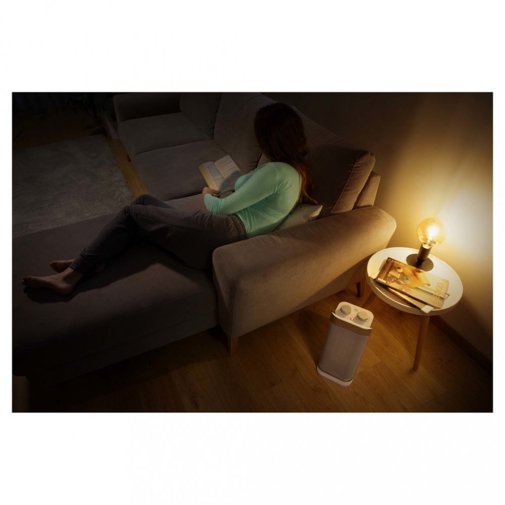 Mám několikanásobné zabezpečení, kterým zaručuji ochranu proti přehřátí i v případě převrhnutí. Základna je mi velkou oporou a stojí stabilně na koberci, podlaze i stolku. Také disponuji nízkou hodnotou hluku. V provozu nepřesahuji 56 dB(A), abych vás nerušilo při relaxaci, spánku nebo četbě.