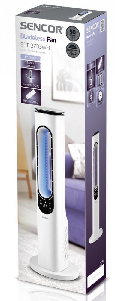 Bezvrtulový ventilátor SENCOR SFT 3703WH je moderní a bezpečné řešení pro osvěžení vašeho domova či kanceláře. Díky bezvrtulové konstrukci je vhodný i do domácností s dětmi. Nabízí 3 rychlosti a 3 režimy provozu, které lze pohodlně ovládat pomocí dotykového panelu nebo dálkového ovladače. Horizontální oscilace v rozsahu 50° zajišťuje rovnoměrné rozložení vzduchu po místnosti. Ventilátor je vybaven LED displejem, který zobrazuje aktuální nastavení a teplotu v místnosti, a 15hodinovým časovačem pro automatické vypnutí. Pro vytvoření příjemné atmosféry nabízí výběr ze tří barev dekorativního podsvícení.