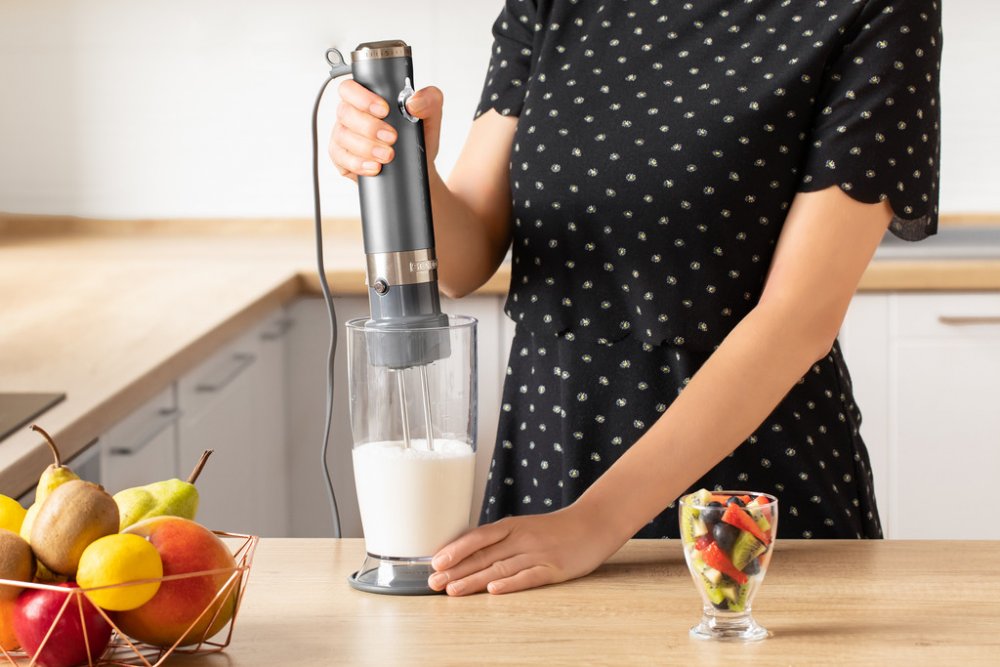 Motor o výkonu 1200 W je extra tichý, takže můžete mixovat třeba o půlnoci. Hlavní vypínač má praktické LED podsvícení, odnímatelný nástavec disponuje tlačítky pro uvolnění. Závěsné očko vám umožní zavěsit mixér kamkoli, kde jej budete mít po ruce.