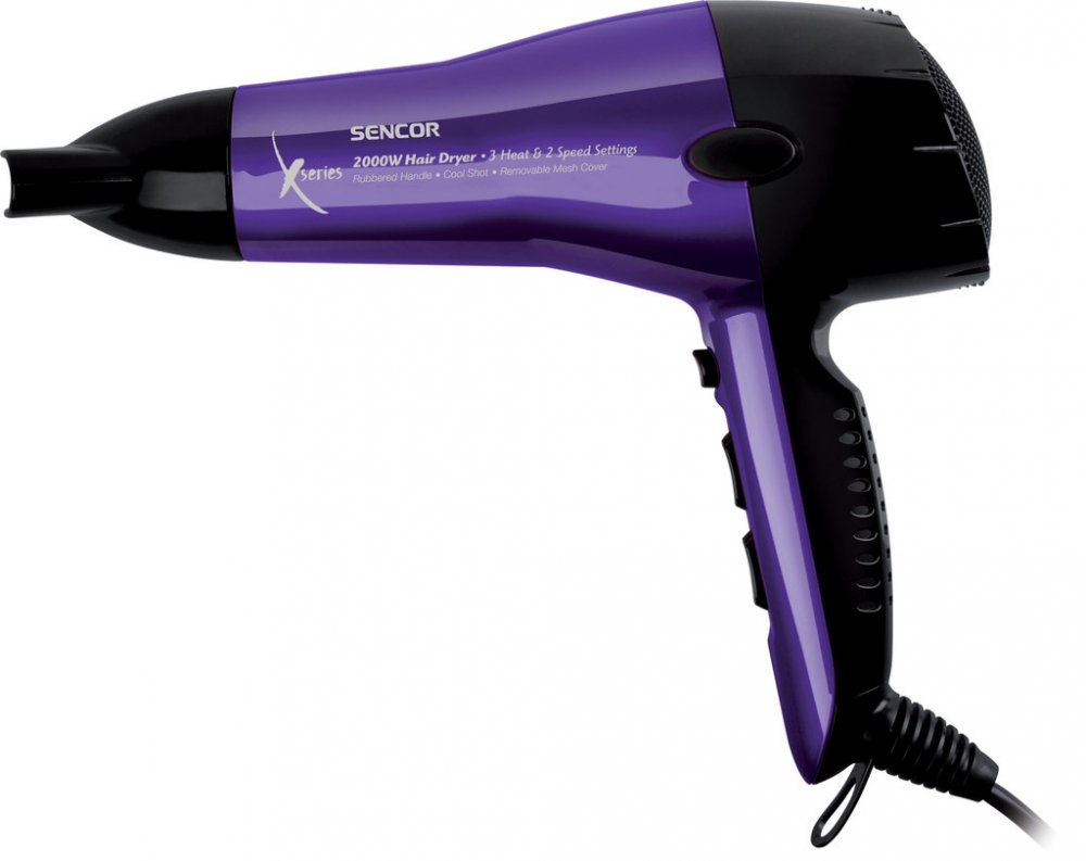 Vysoušeč vlasů Příkon 2000W Ultralehká konstrukce 3 stupně nastavení teploty 2 stupně nastavení rychlosti Vzduchová tryska Tlačítko studeného vzduchu Odnímatelná zadní mřížka pro snazší čištění Pogumovaná zadní část rukojeti Závěsné očko Gumové ochranné boční nárazníky zabraňující odření fénu při odložení Tepelná pojistka proti přehřátí motoru Délka přívodní šňůry: 2,6 m