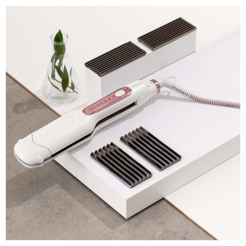 Asi každá žena ví, že dokonale upravený účes, je krásný účes. Jako Sencor žehlička na vlasy SHI 6300GD nabízím péči 3 v 1. Součástí mého balení jsou tři vyměnitelné plochy, s kterými vlasy rovnám i krepuji dvěma způsoby. Žehlící plochy jsou velmi snadno vyměnitelné a nadprůměrně splňují očekávaný výsledek. Díky možnosti výběru, je jedna plocha jemně vlnitá a druhá více, abyste si vždy přišli na své.