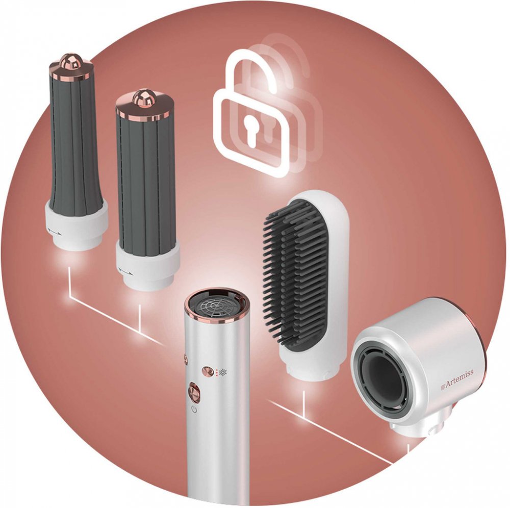Jednotlivé nástavce lze velmi snadno vyměnit. Stačí jen uvolnit zámek pojistky na zadní straně kulmofénu Artemiss, vytáhnout nástavec, zaměnit za jiný a zámek pojistky pustit. Součástí je i jeden magnetický nástavec, který skvěle pasuje na hlavici pro vysoušení vlasů, a přináší tak další možnost stylingu.