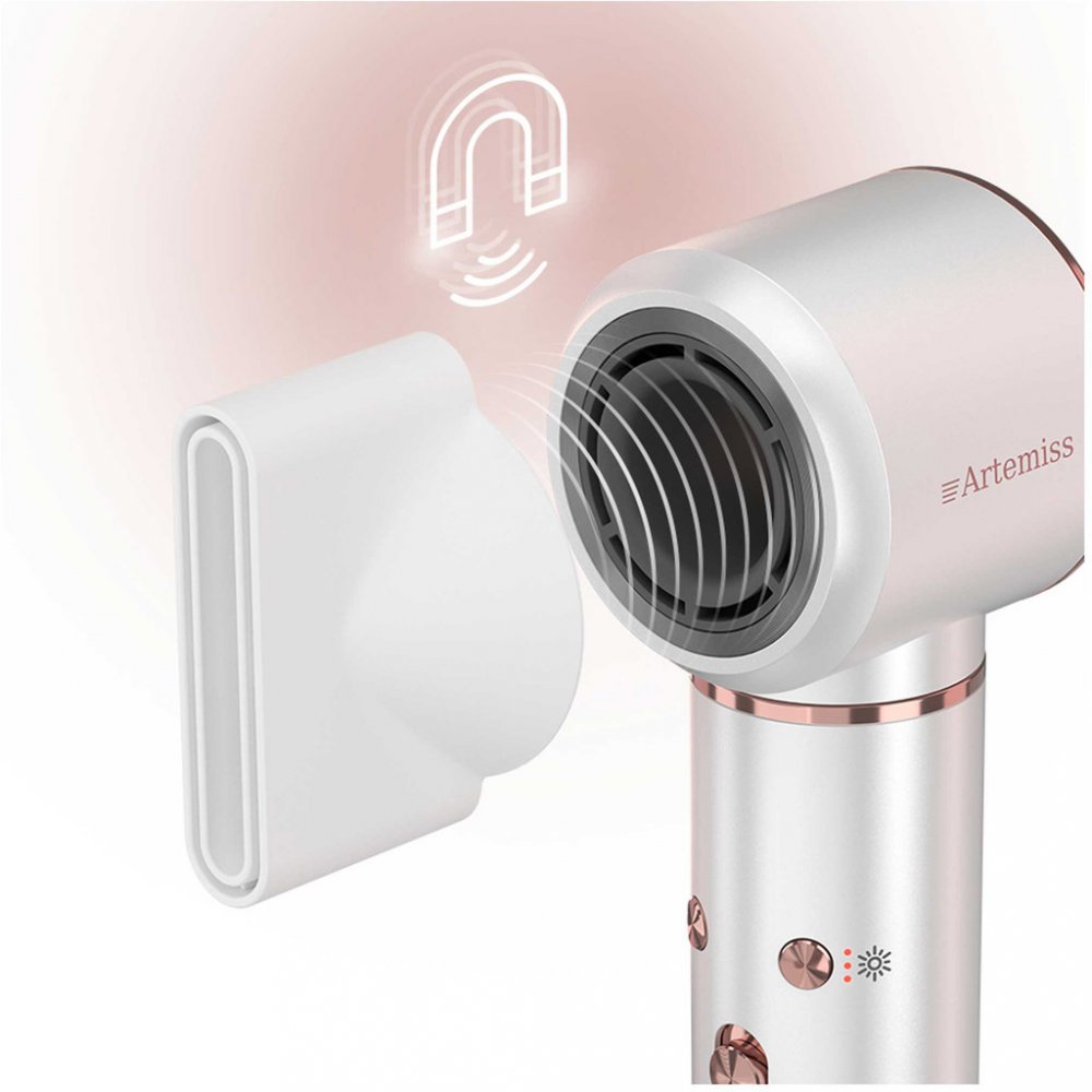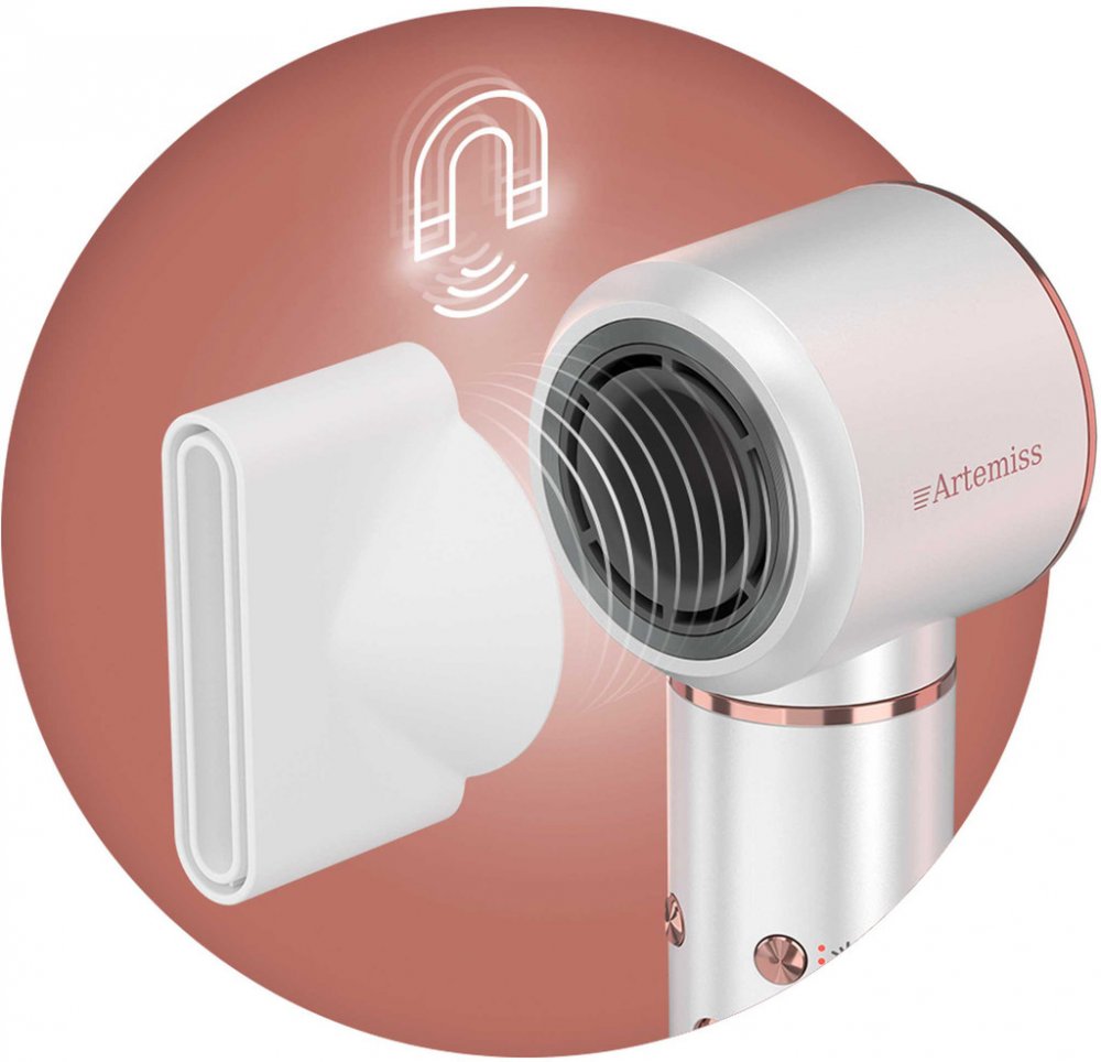 Artemiss nabízí 3 nastavení rychlosti proudění vzduchu – nízkou, střední a vysokou – které si navolíte zmačknutím levého tlačítka. Naopak tlačítkem vpravo nastavíte 1 ze 4 teplot od rychlého vysoušení a stylingu, běžného vysoušení a šetrného vysoušení až po stálý proud chladného vzduchu. Kombinací vysoké teploty a rychlosti proudění budou vaše vlasy vysušené během chvilky.