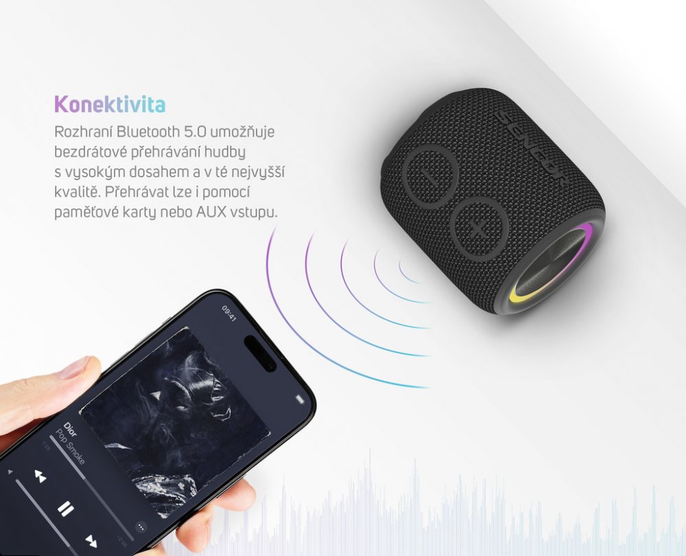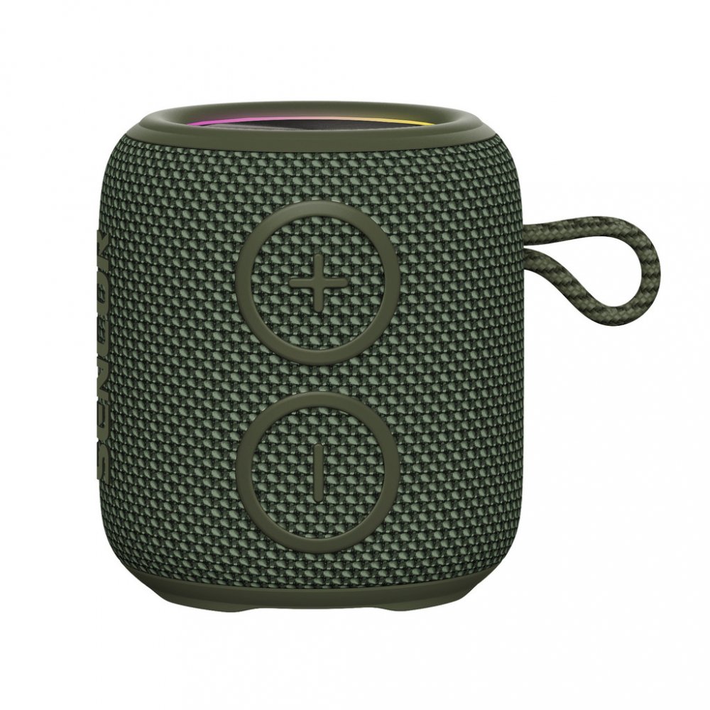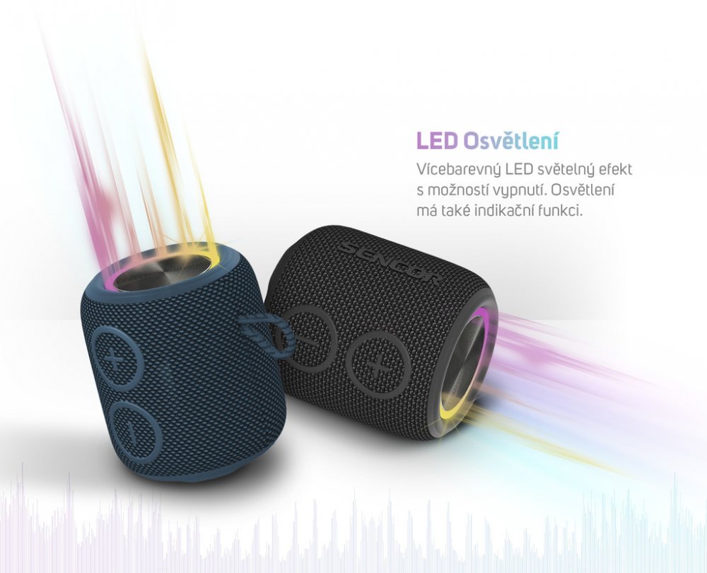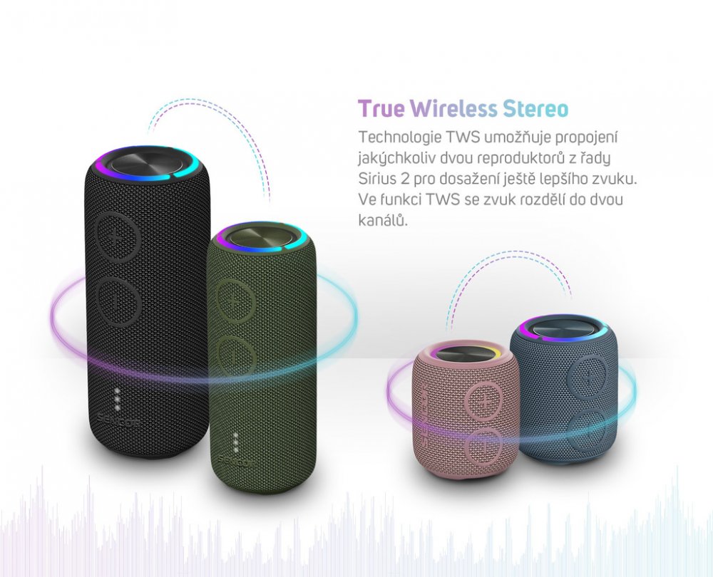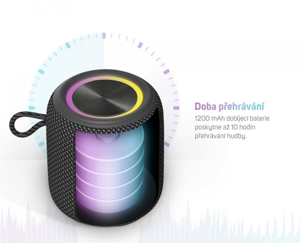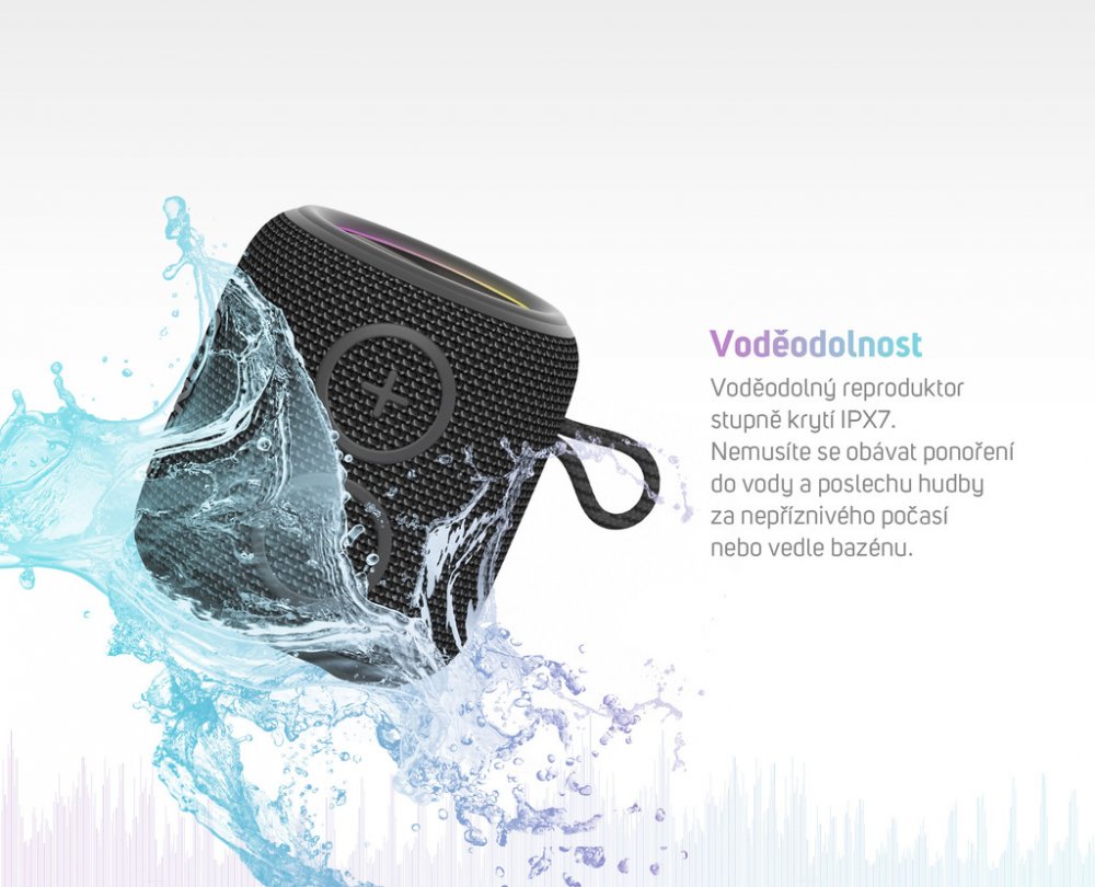přenosný reproduktor • výkon 5 W • hudba přes Bluetooth • odolnost IPX7 • USB vstup s možností nabíjení zařízení • výdrž baterie až 10 hod • možnost propojení dvou reproduktorů s funkcí True Wireless