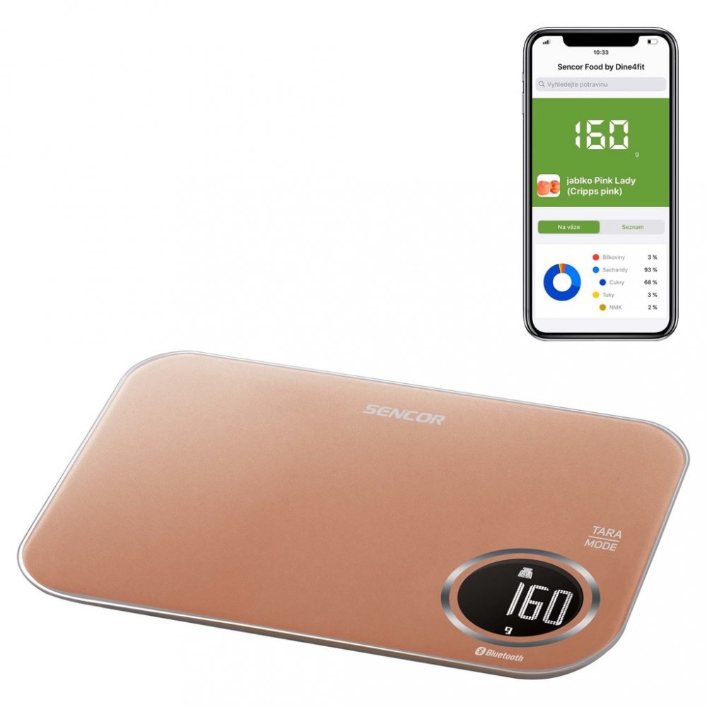 Váha je vybavena bezdrátovou technologií Bluetooth, která ve spojení s bezplatnou aplikací Sencor FOOD nainstalovanou do vašeho chytrého zařízení nabízí přímý přístup k bohaté a pravidelně aktualizované databázi potravin a jejich nutričním hodnotám.