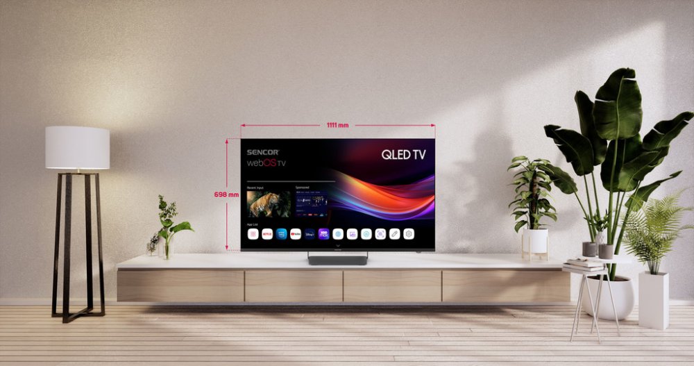 Sencor 126 cm QLED 50 palců WebOS 2024 Černá Magický ovladač, ovladač, návod, stojan 3840 x 2160 16 : 9 60 1.5-2.5m optimální Standardní podpora HDR 3 2 3 porty Snadná montáž (standardní VESA) 10.5 kg 200 x 200 Vyžaduje 120cm+ nábytek 1112 x 648 x 83 mm Připraveno pro 4K HDR streaming G 127 kWh 70 kWh 1898731 Vyžaduje externí systém