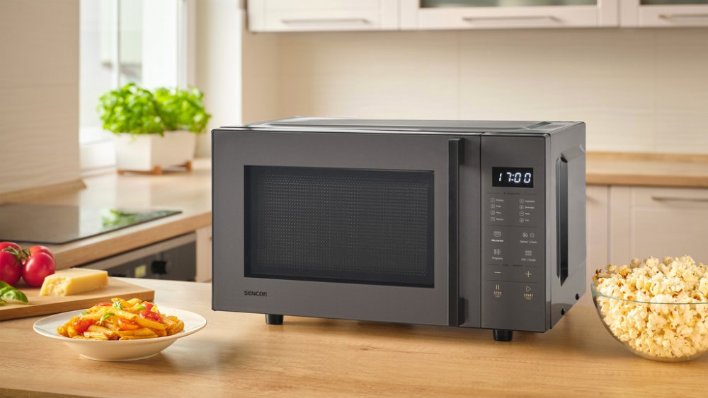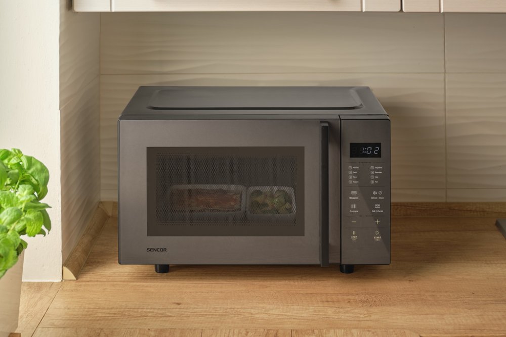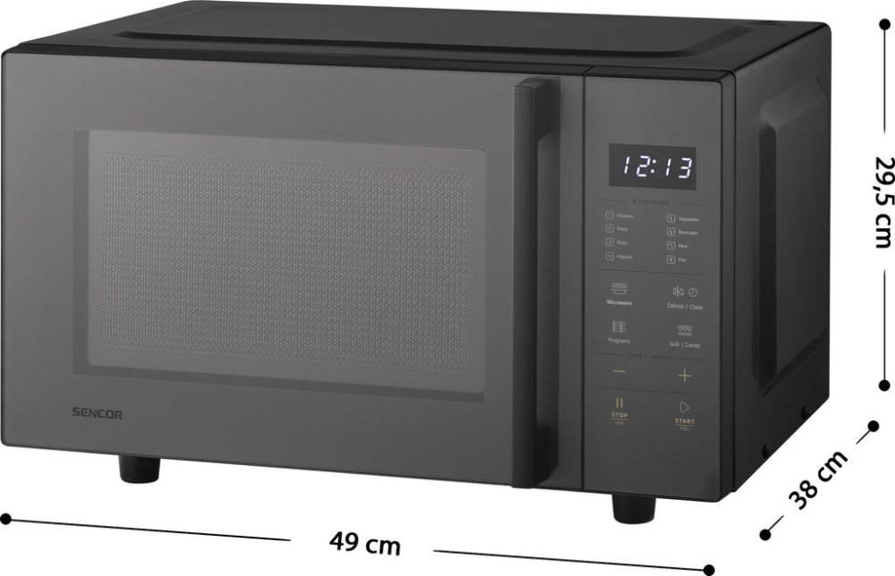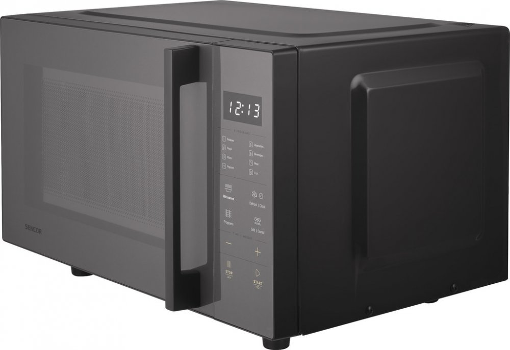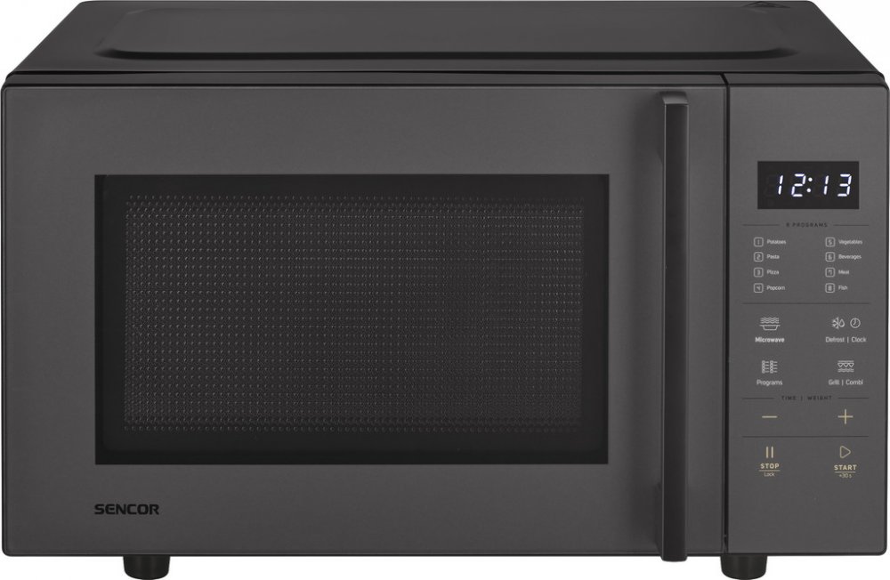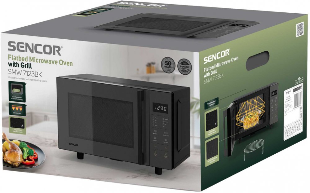 Mikrovlnná trouba Sencor SMW 7123BK Technologie Flatbed bez otočného talíře pro větší prostor na nádoby různých tvarů Deska z borosilikátového skla o rozměrech 26 x 25,5 cm Mikrovlnný ohřev pro jednoduché a rychlé ohřátí nebo vaření Funkce grilu Objem 23 l Elektronické dotykové ovládání LED displej se zobrazením hodin Nastavení 5 úrovní mikrovlnného výkonu 2 režimy kombinovaného mikrovlnného vaření a grilu Rozmrazování dle váhy a času 8 přednastavených programů vaření 60minutový časovač Zvuková signalizace Dětská pojistka Grilovací rošt Quartz gril Vnitřní prostor s vlastnostmi keramického povrchu pro větší odolnost proti poškrábání a snadnější čištění Mikrovlnný výkon 800 W Gril 1000 W