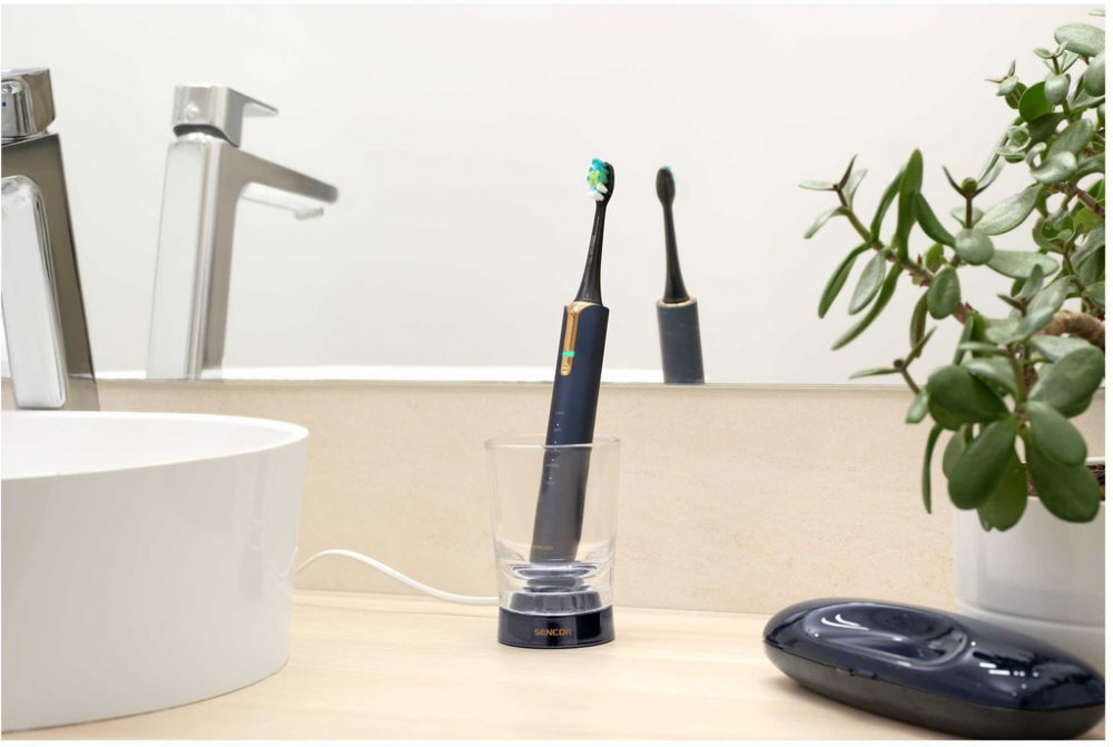 Elektrický sonický zubní kartáček • rychlost až 40 000 stěrů za minutu • 5 čisticích a regeneračních programů pro zuby i dásně • stylová sklenička s indukčním nabíjením • Quadpacer technologie pro rovnoměrné čištění • úsporný provoz s výdrží až 45 dní • pouzdro s USB konektorem a UV sterilizátorem • 2 výměnné kartáčkové hlavice • barva: černá SENCOR SOC 4110BL zubní kartáček