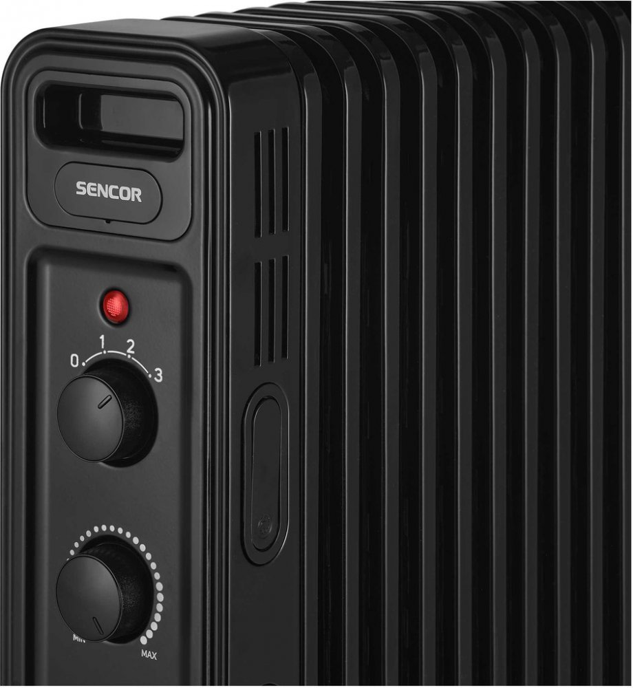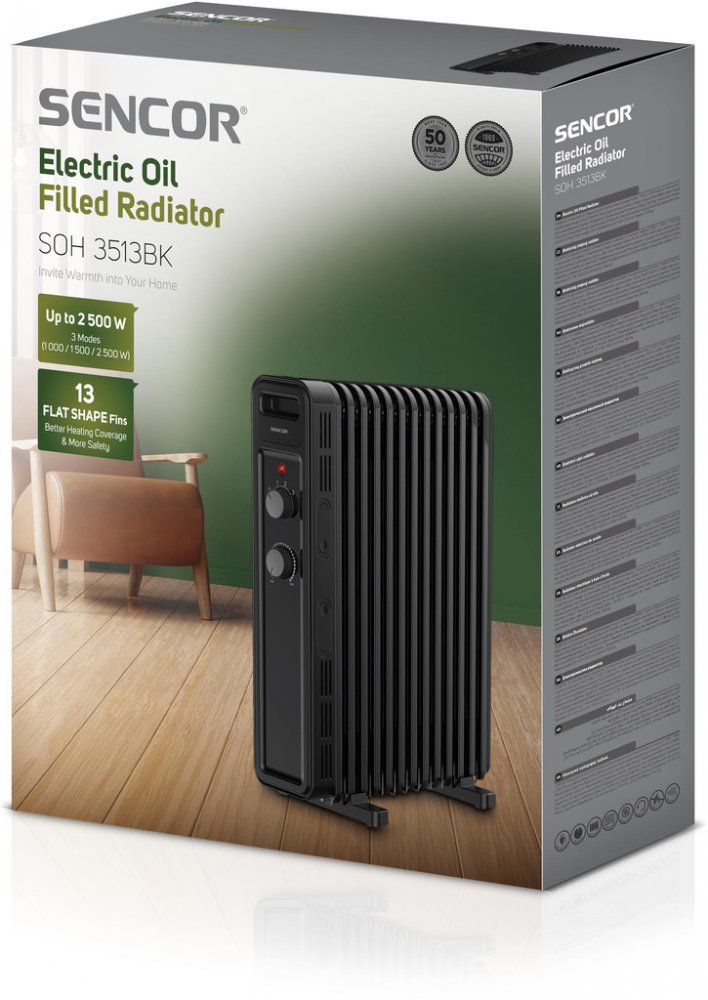 Na chalupe, v kancelari, v dilne nebo v loznici – vsude tam, kde si potrebujete zatopit ci pritopit, ocenite bezhlucny provoz, rychly nabeh topneho vykonu i vysokou akumulacni schopnost elektrickych olejovych radiatoru SENCOR s topnymi clanky FLAT SHAPE. Na vyber je ucelena rada modelu v cerne a bile barve v nabidce od 7 do 13 topnych zeber. Primo tenhle 13 zebrovy model SOH 3413WH bile provedeni / SOH 3513BK cerne provedeni nabizi prikon 2 500 W ve trech vykonovych stupnich 1 000 / 1 500 / 2 500 W a s plynulou regulaci termostatu. Oboji pohodlne ovladatelne 2 klasickymi otocnymi volici na prednim panelu topeni, kdy na hornim knofliku volite vykonovy stupen a na spodnim nastavujete termostat.