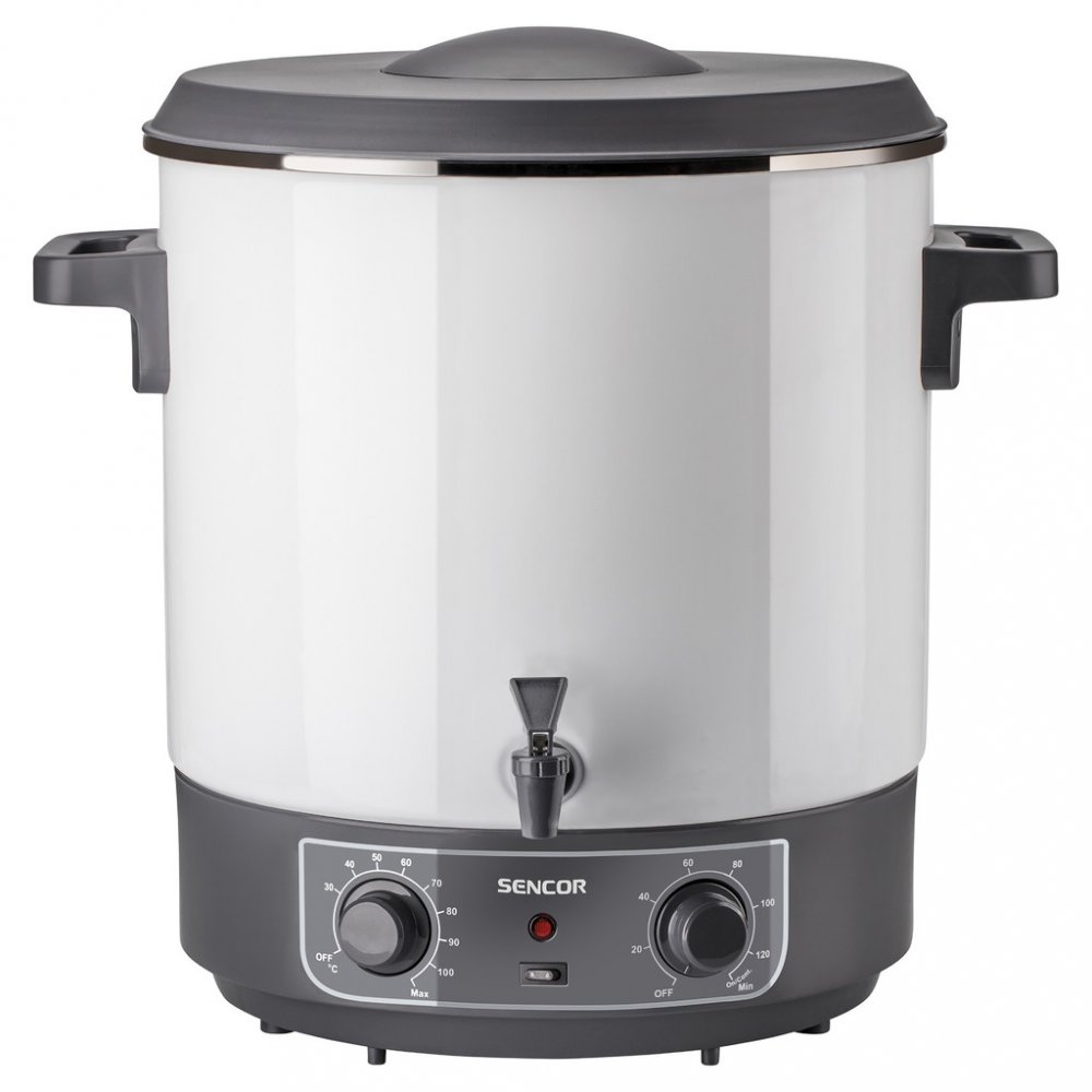 Zavařovací hrnec SENCOR SPP 2100WH je výkonný a spolehlivý pomocník pro domácí zavařování ovoce, zeleniny nebo hub. Díky objemu 27 l zvládne zpracovat až 14 litrových sklenic najednou. Výkon 1 800 W zajišťuje rychlý ohřev, plynule nastavitelný termostat umožňuje přesné řízení teploty a vestavěný časovač zajistí dokonalé výsledky bez nutnosti neustálého dohledu. Hrnec lze využít i pro přípravu horkých nápojů, polévek nebo svařeného vína.