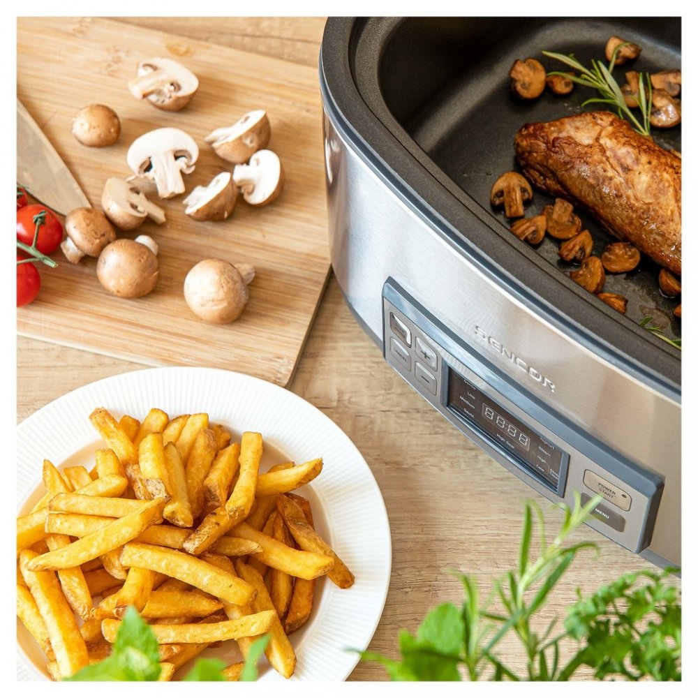 Se mnou je příprava jídel nesmírně snadná a za minimum času stráveného v kuchyni. Jsem totiž pomalý hrnec od Sencoru. Jídla připravuji zdravě s výraznějšími chutěmi! Se mnou už nemusíte solit a kořenit jako o závod, a dokonce zcela bez použití tuku. Bez tuku se hodím na celou řadu d