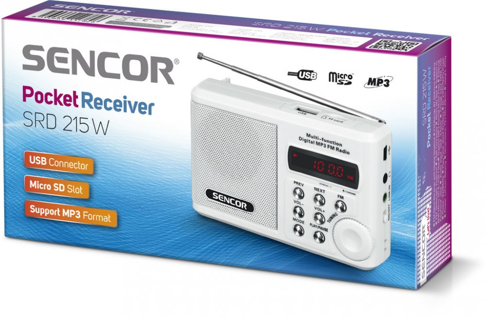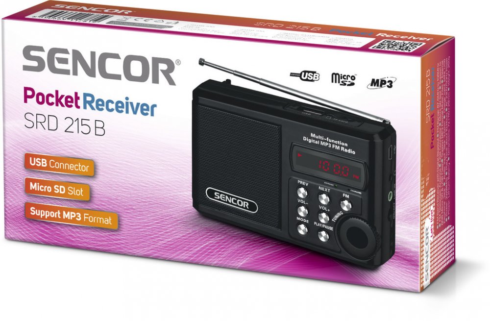 Sencor Analogové FM rádio. přehrávání MP3 Slot na micro SD kartu - max 8GB Přenosná rádia 29 mm 72 mm 110 mm 250 g