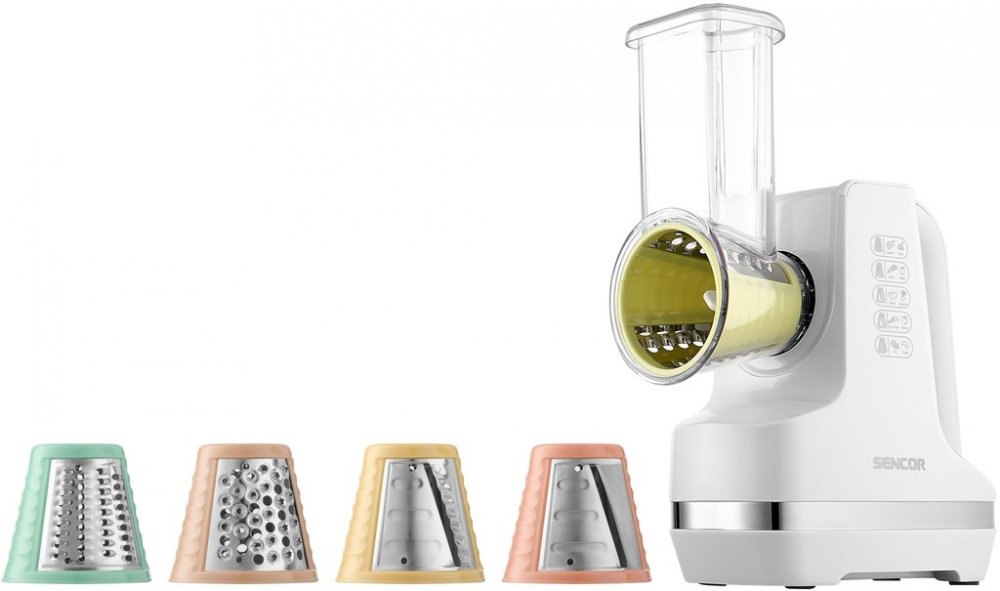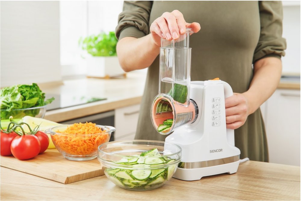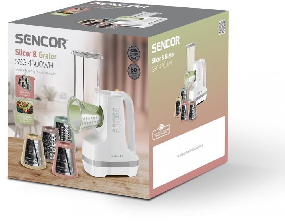 Ušetřete čas v kuchyni s univerzálním kráječem SSG 4300WH. Tento moderní asistent se skvěle hodí na kuchyňskou linku, kde bude pevně stát díky protiskluzovým nohám. Tvar krájení a strouhání můžete zvolit nasazením jednoho z 5 přiložených nástavců. Stačí stisknout tlačítko pro spuštění motoru a můžete si připravit barevné pohoštění, polévky, saláty a jiné skvělé recepty.