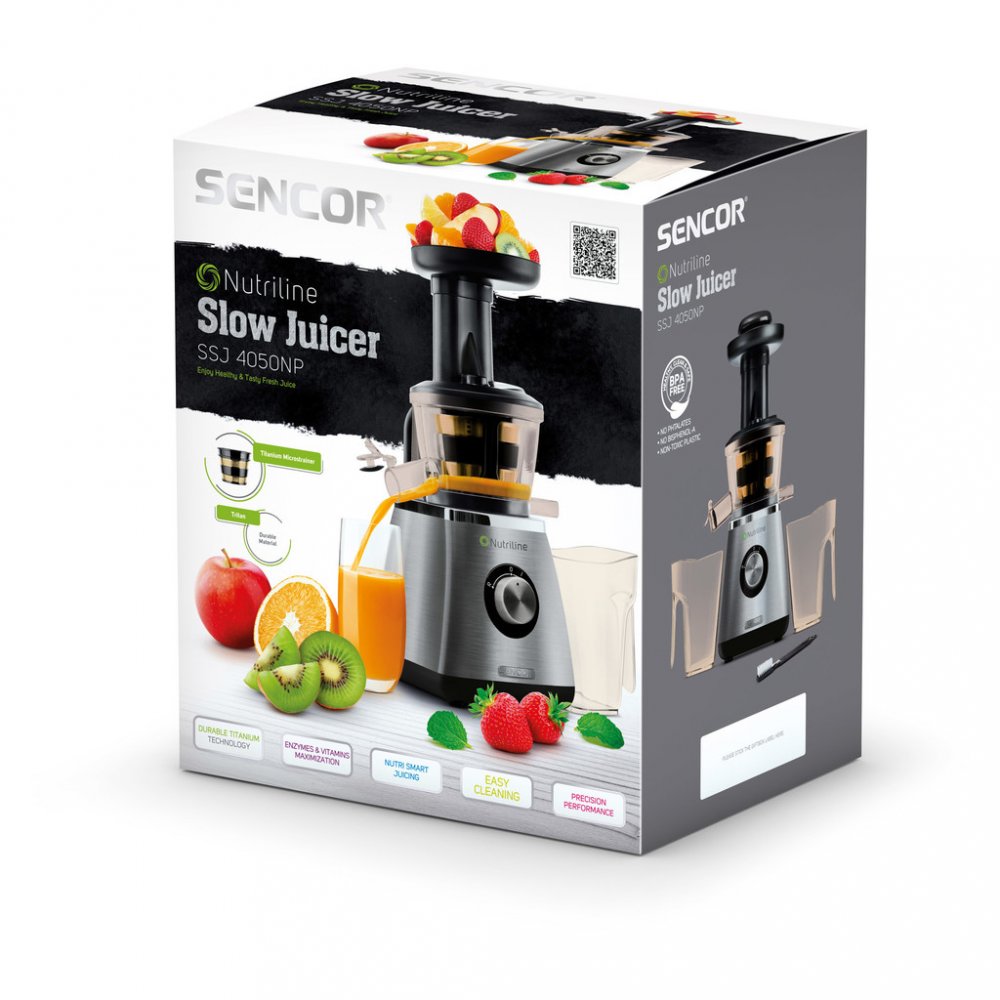 Šnekový odšťavňovač Sencor SSJ4050NP a vysoce efektivním odšťavňováním. Titanové filtrační mikrosíto. Odšťavňovač SSJ4050NP má automatické oddělení dřeně. Nádoba na dřeň o objemu 0,8 l. Nádoba na šťávu o objemu 0,8 l. Titanové filtrační mikrosíto. Transparentní odšťavňovací miska pro dobrou viditelnost na průběh odšťavňování. Odšťavňovač Sencor SSJ4050NP má vysoce účinný 400 W motor.Trojitá ochrana:- Motor se spustí pouze, pokud je přístroj správně sestaven- Funkce automatického vypnutí v případě sejmutí krytu- Funkce automatického vypnutí v případě přehřátí motoruVýhodou odšťavňovače Sencor SSJ4050NPje jeho pomalá rychlost 60 ot./min. pro uchování všech vitamínů a enzymů. Protiskluzové nožky s přísavkami pro bezproblémové použití. Robustní motor určený pro souvislé 15minutové odšťavňování. Délka přívodního kabelu: 110 cm. Rozměry (délka x šířka x výška): 230 x 210 x 445 mm. Hmotnost: 4,15 kg. Hlučnost: