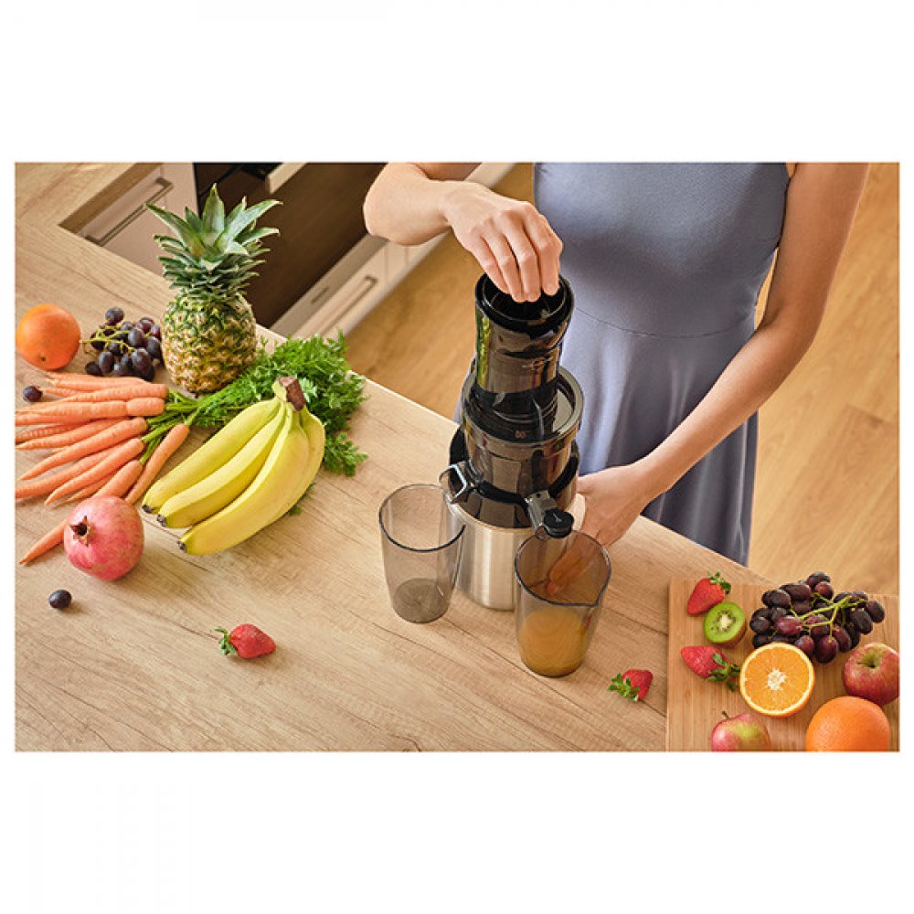 Nerezové tělo a široký podávací otvor (78 mm) pro pohodlné vkládání ovoce a zeleniny