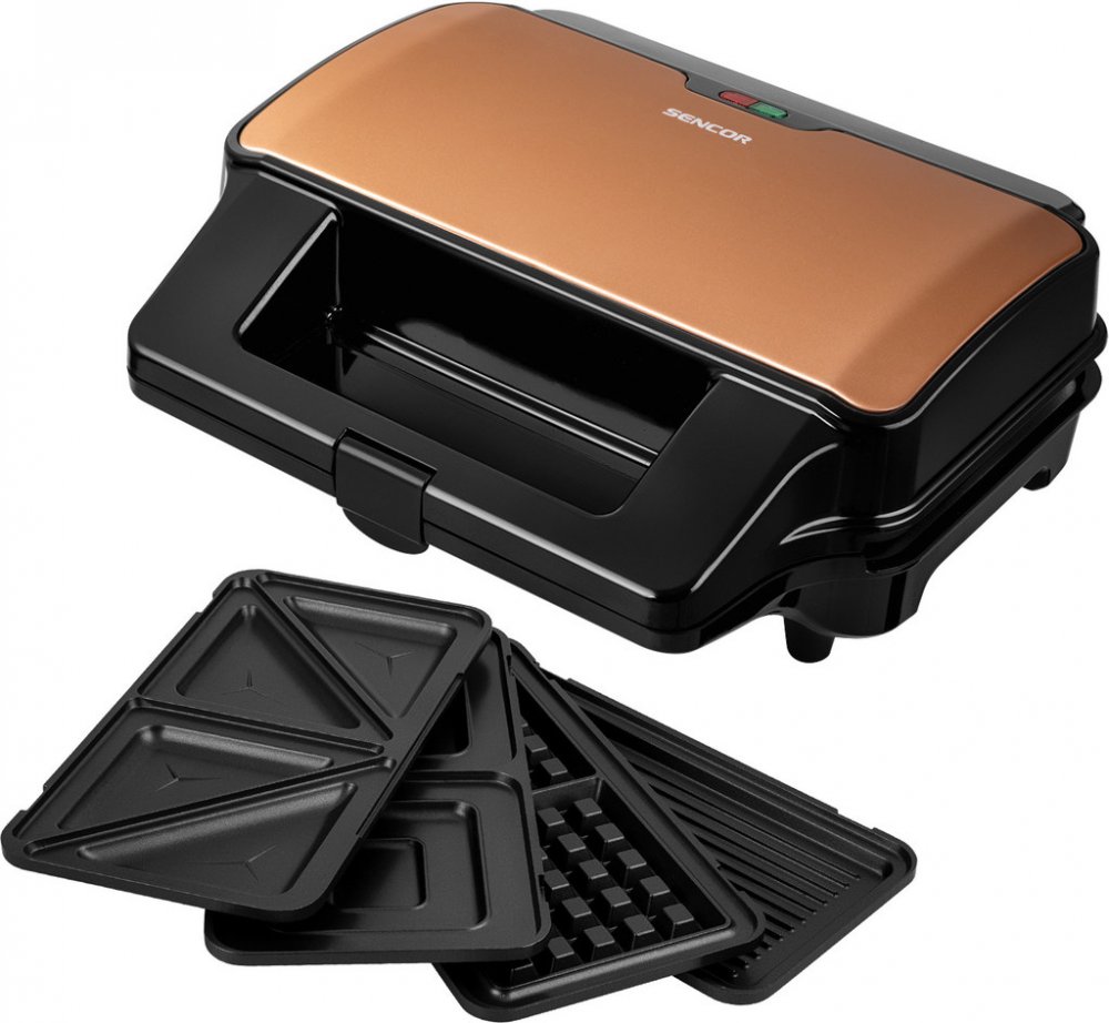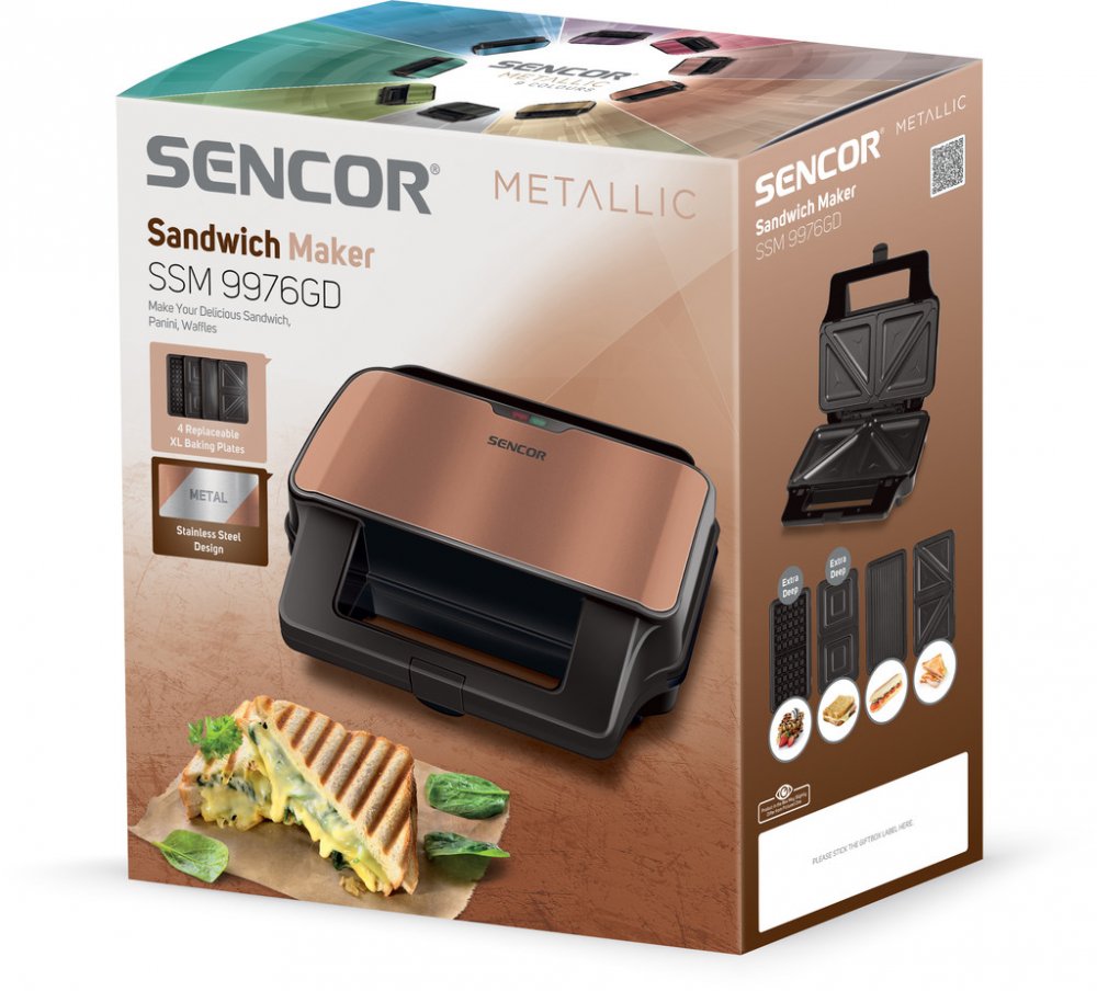"Rádi si v pohodlí domova dopřáváte toasty, panini, bagety a vafle? Pak vsaďte na Sencor sendvičovač s výměnnými deskami SSM 9976GD. Připraveny jsou pro vás rovnou čtyři vyměnitelné pečicí plochy pro jednotlivé druhy pečiva, dokonce i typický americký sendvič větší velikosti. Jistě vás oslní zajímavý metalický design. Zlatou barvu dobře zkombinujete s jakýmkoliv vzhledem kuchyňské linky. Výhodou sendvičovače je, že jsou jeho desky nepřilnavé, a tak se velmi snadno čistí.
