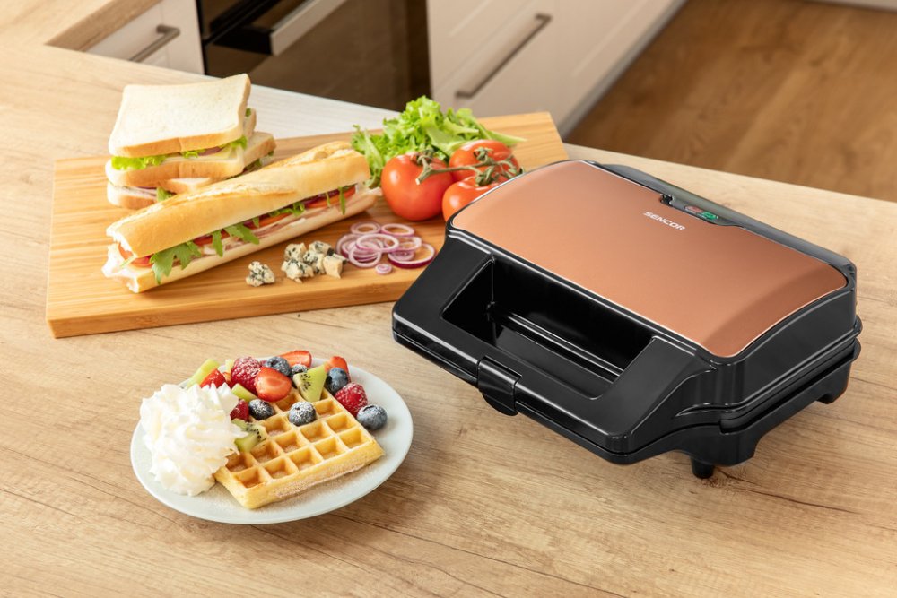 Zapečené dobroty se Sencor sendvičovačem s výměnnými deskami SSM 9976GD.
