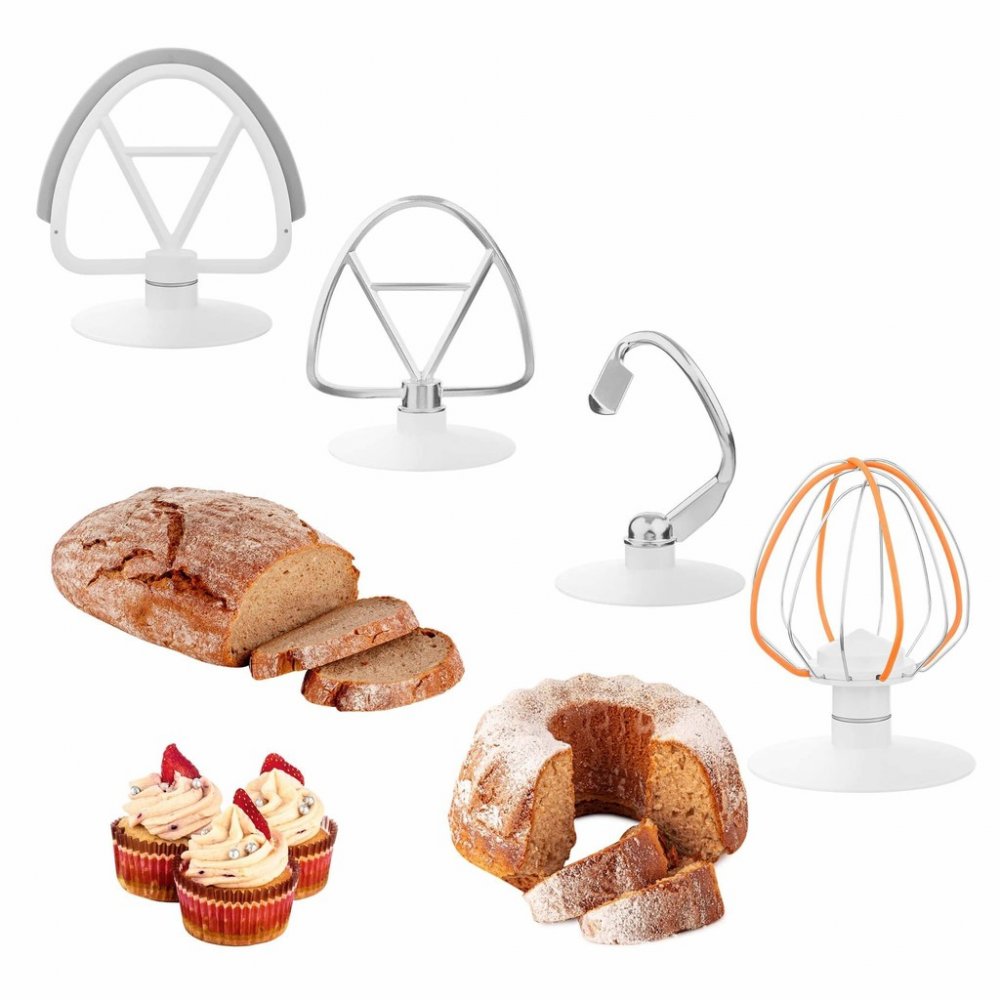 Součástí balení jsou 4 nástavce na hnětení a šlehání. Speciální FLEXI šlehač a FLEXI metla pro jemná těsta, Součástí jsou též magnetická víka, díky kterým můžete nechat těsto odpočinout.
